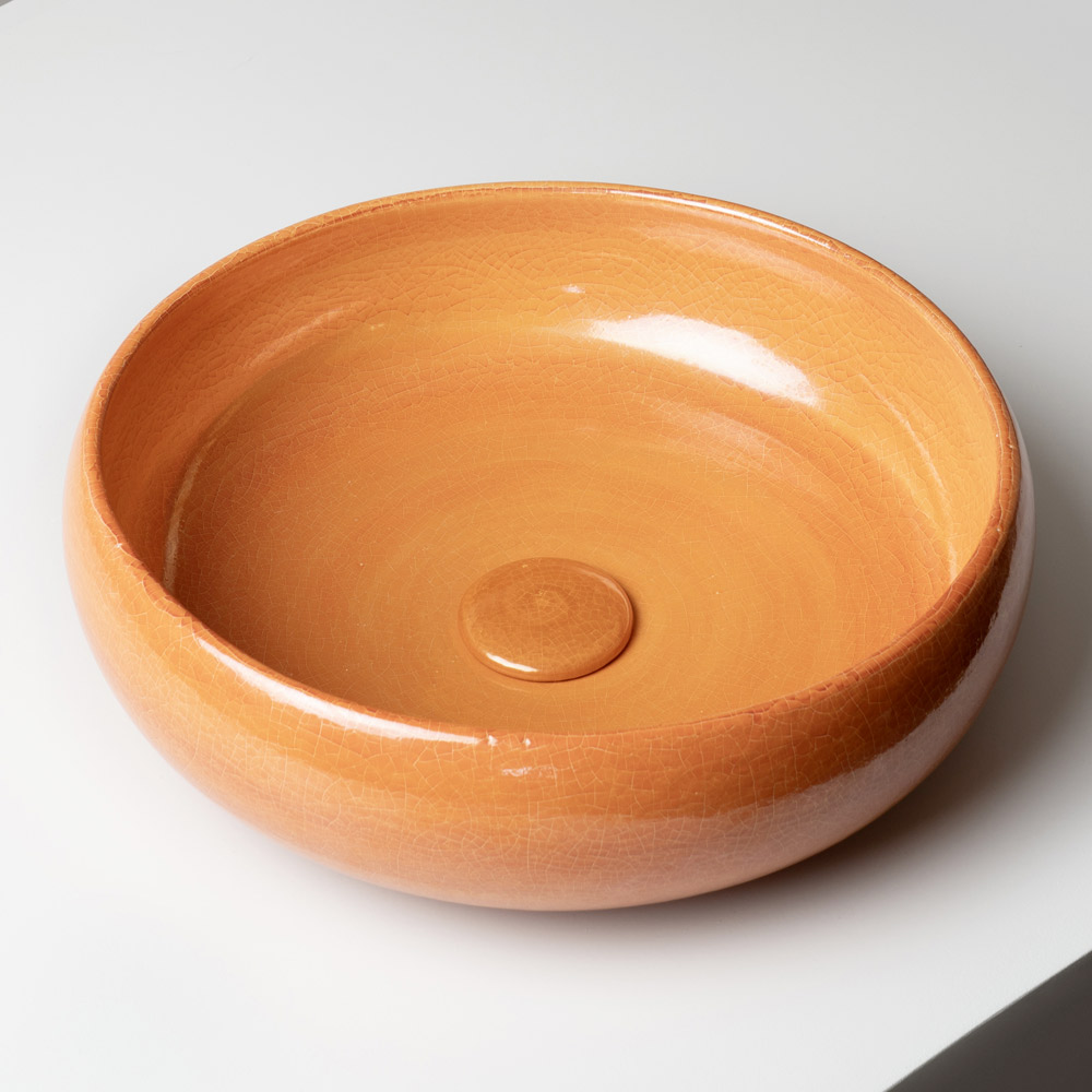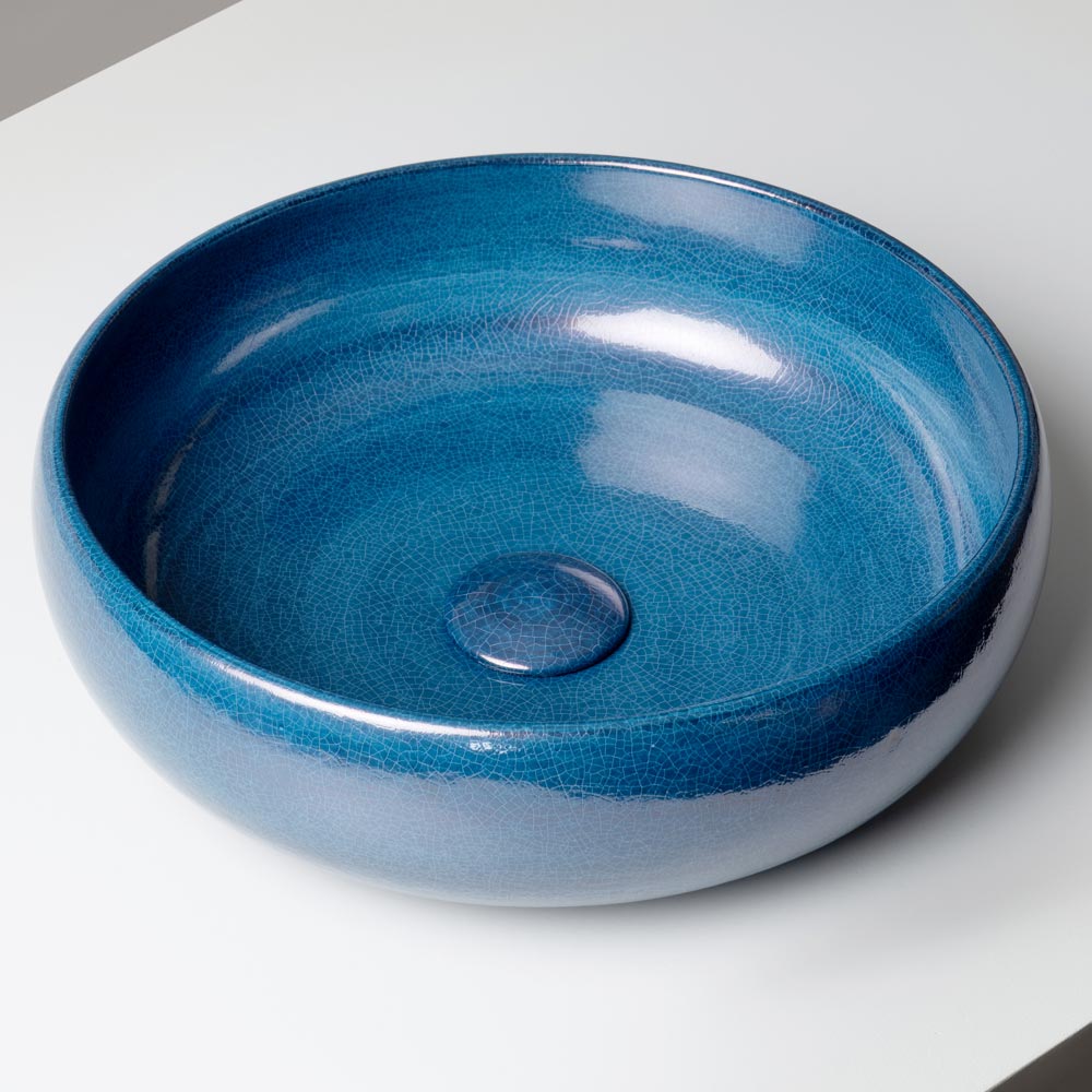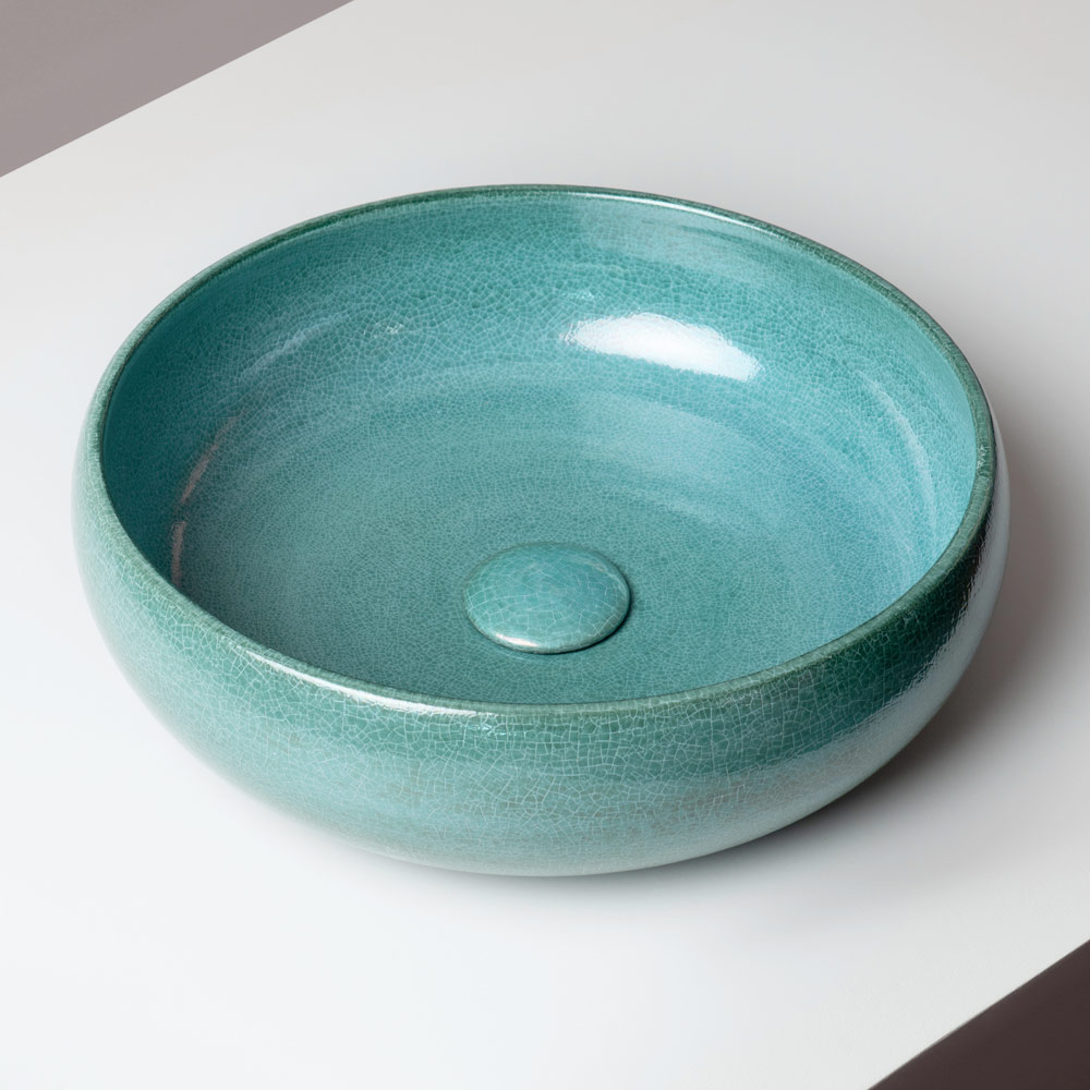 A forma essencial e primordial é equilibrada por proporções harmoniosas, enquanto a superfície esmaltada cria reflexos vibrantes e irregulares que tornam cada pia única. O craquelê característico do Raku realça o aspecto texturizado e artesanal do produto, transformando-o em um verdadeiro elemento decorativo.