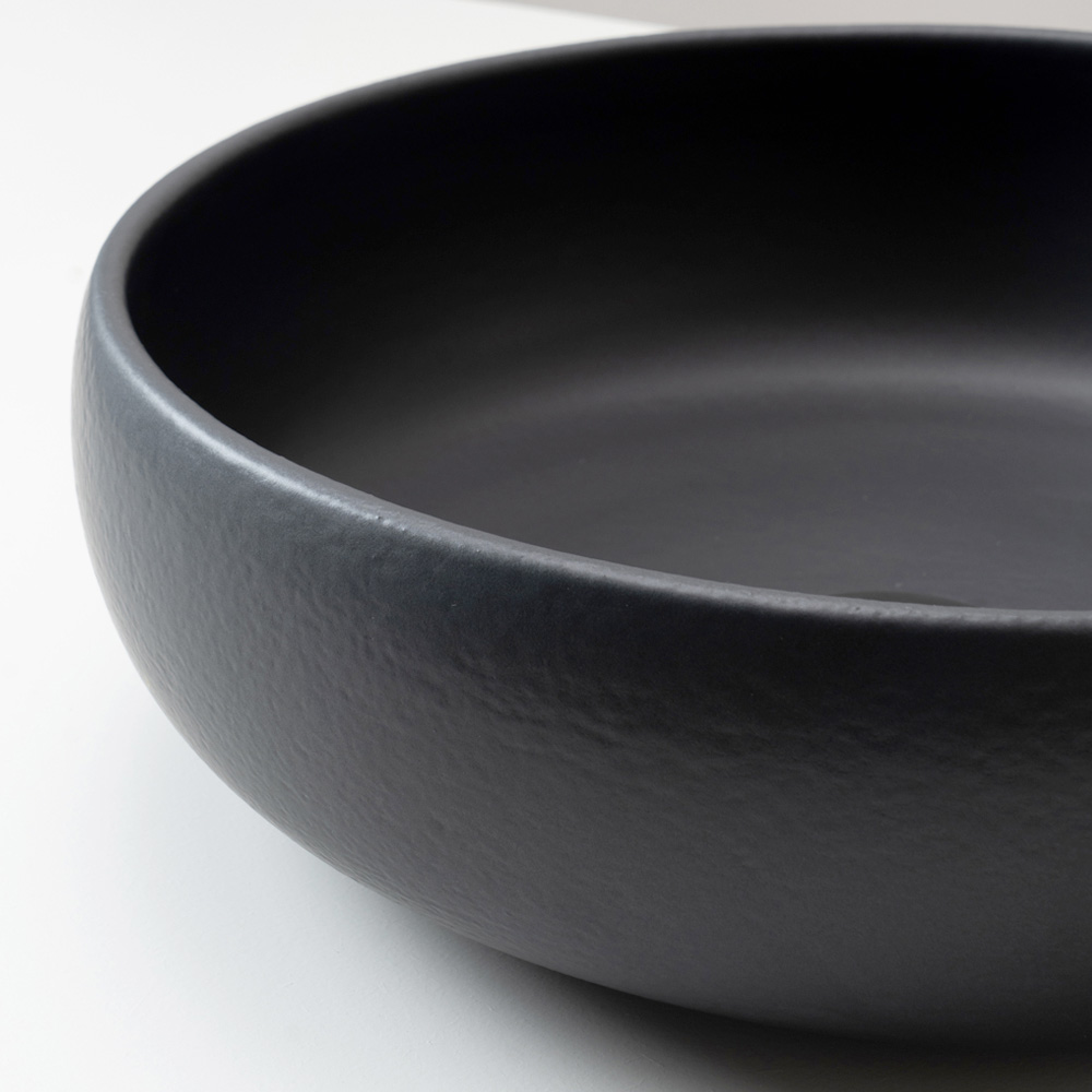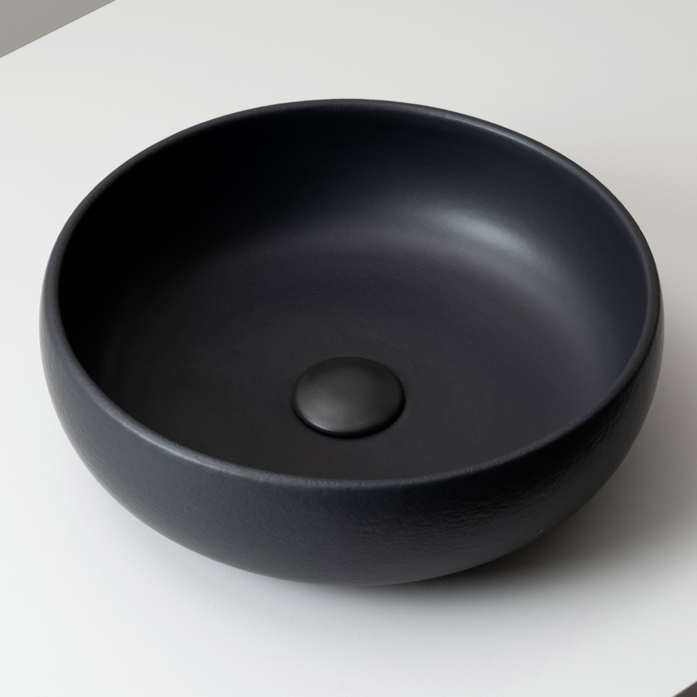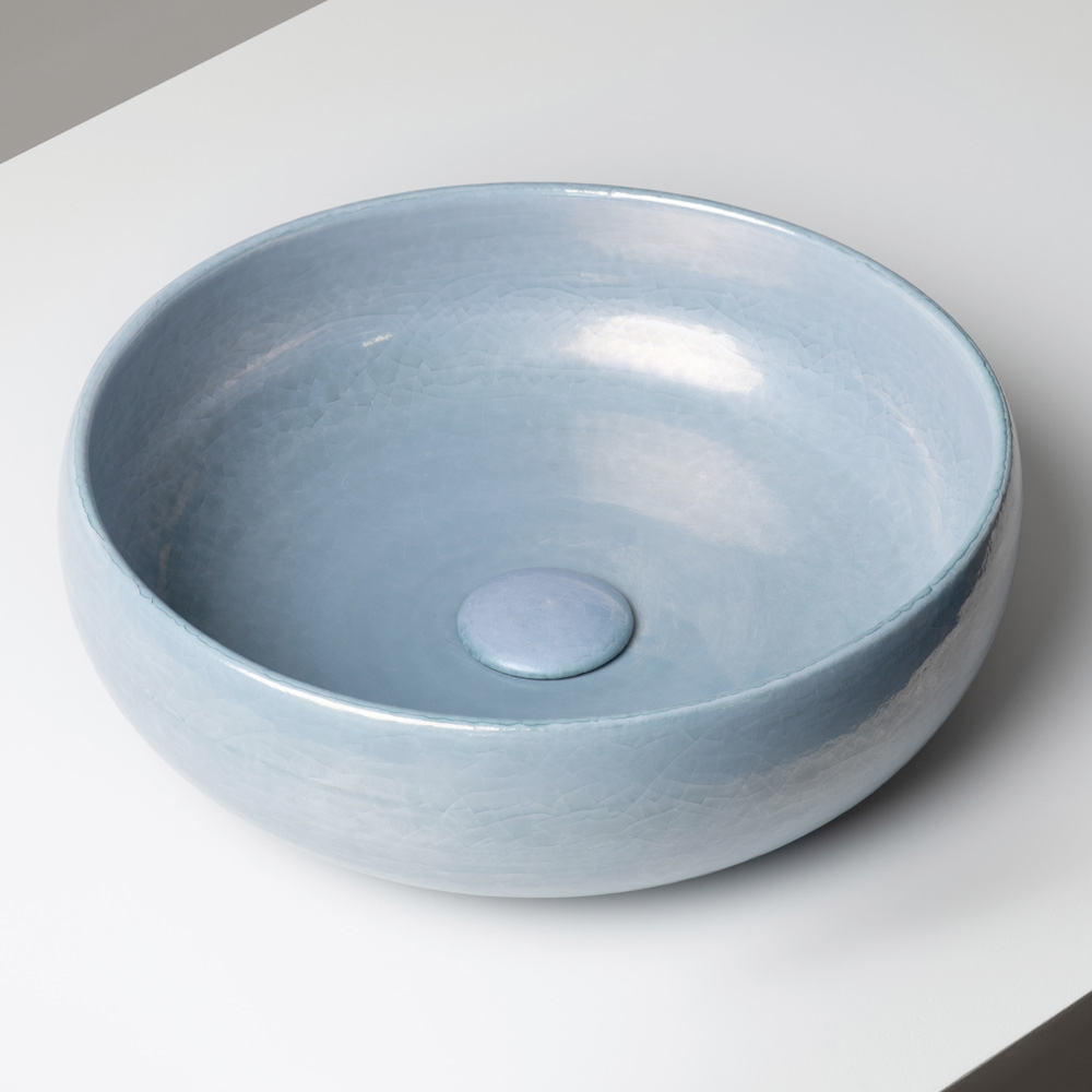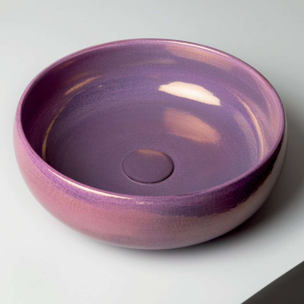 A forma essencial e primordial é equilibrada por proporções harmoniosas, enquanto a superfície esmaltada cria reflexos vibrantes e irregulares que tornam cada pia única. O craquelê característico do Raku realça o aspecto texturizado e artesanal do produto, transformando-o em um verdadeiro elemento decorativo.