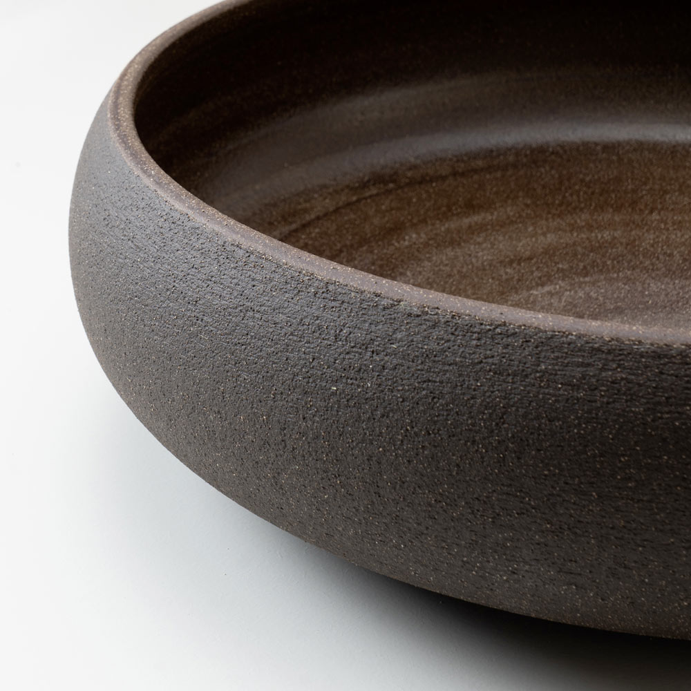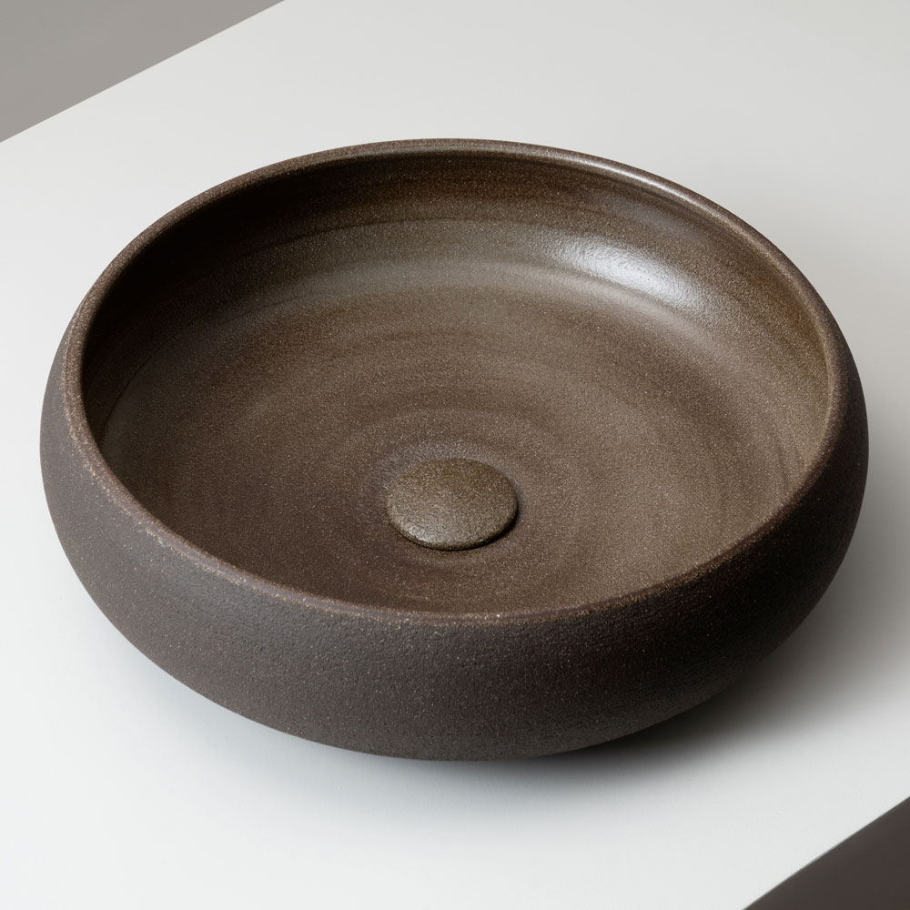 O interior possui um acabamento cristalino transparente e brilhante , garantindo uma superfície lisa e luminosa, enquanto o exterior mantém a textura da argila refratária, disponível em duas variações de cor. O contraste entre as superfícies esmaltadas e naturais realça o caráter artesanal da pia.