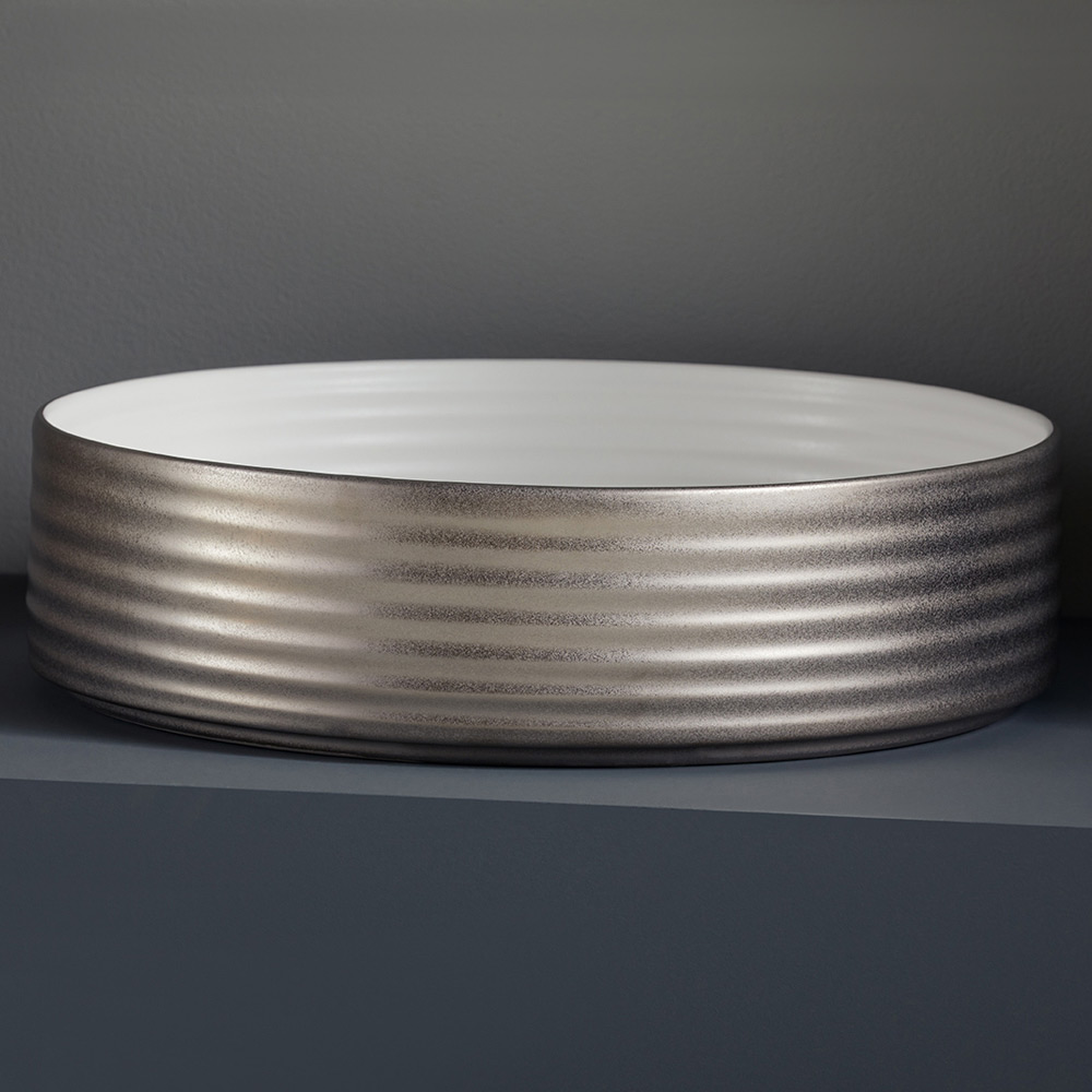 suavidade fluida moldada pelo homem, onde superfícies onduladas captam a luz e moldam o material. Este lavatório torna-se assim num