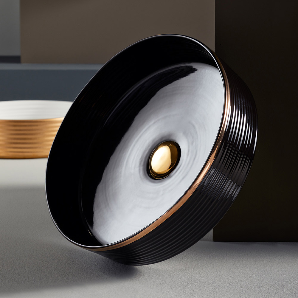 - Esmalte preto brilhante interior e exterior, borda dourada brilhante