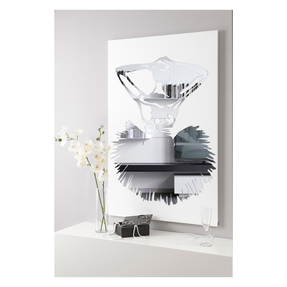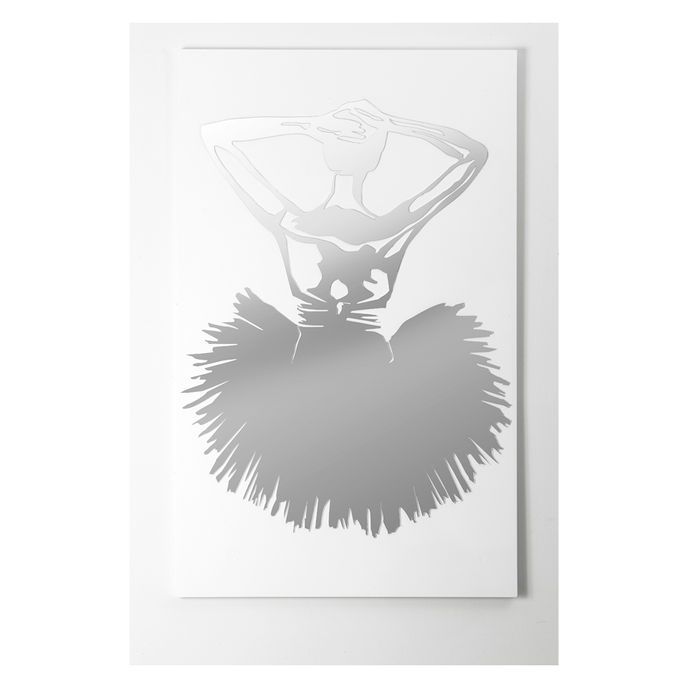 O painel decorativo é feito com a técnica de marcação a laser que cria um baixo-relevo no material, criando diferentes gradações de cores. O quadro é feito de madeira lacada a branco com decoração espelhada. Representa uma bailarina feita em plexiglás espelhado na verdade tem também funcionam como um espelho.
