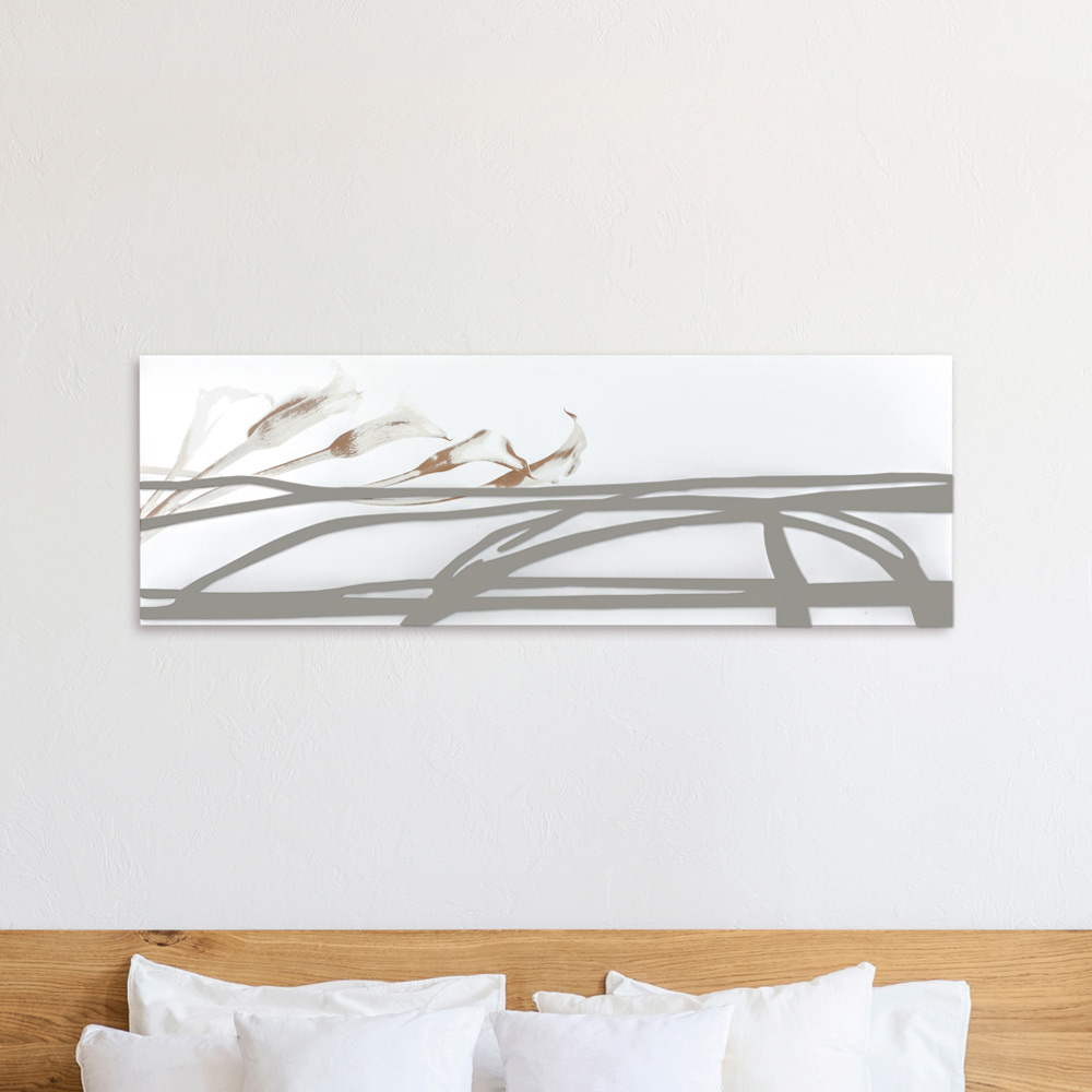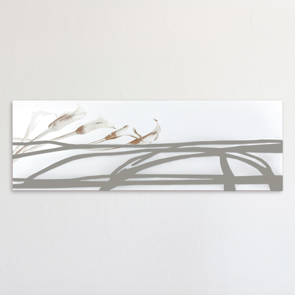 O painel decorativo é feito com a técnica de marcação a laser que cria um baixo-relevo no material, criando diferentes gradações de cores criadas no painel. O painel é feito de madeira lacada a branco com aplicações de argila colorida . O painel é elegante e sóbrio, graças à decoração em plexiglass espelhado e à marcação dos copos-de-leite.