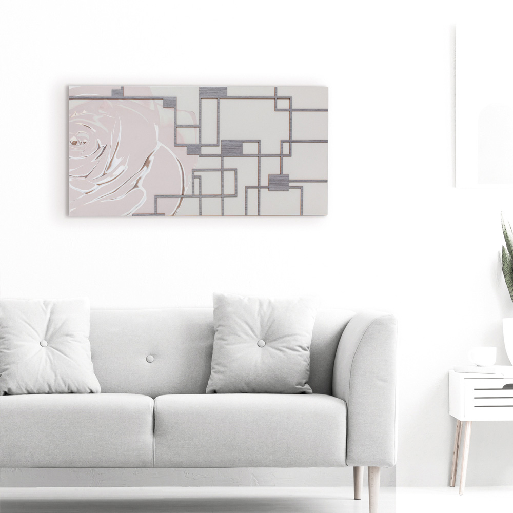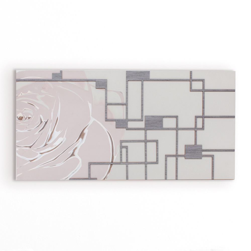 O painel decorativo é feito com a técnica de marcação a laser que cria um baixo-relevo no material, criando diferentes gradações de cores das pétalas criadas no painel. A estrutura é feita de madeira lacada a areia com aplicações cinza . Tons suaves de rosa brincam com a decoração geométrica em madeira cinza.