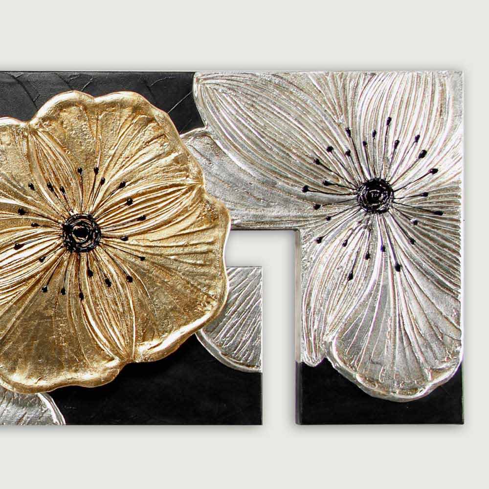 Composição floral sobre tela, decorado à mão. Os elementos decorativos são feitos de resina, ouro e folha de prata sobre um fundo preto. Acabamento brilhante.