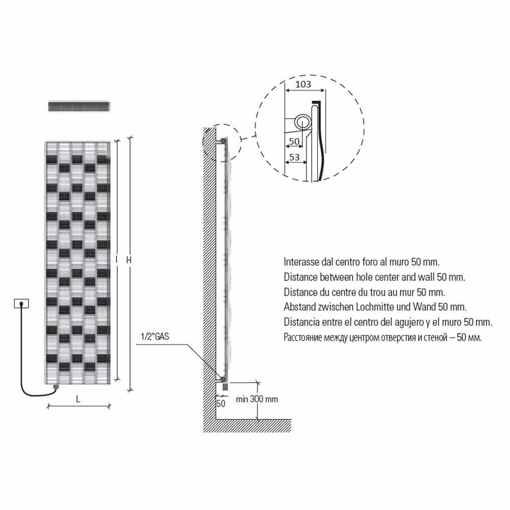 O termostato de 110 mm deve ser adicionado à altura. Caixa termostática branca como padrão para radiadores brancos; cromo para os radiadores coloridos e acabamentos em aço inoxidável. Fonte de alimentação monofásica de 230 volts.