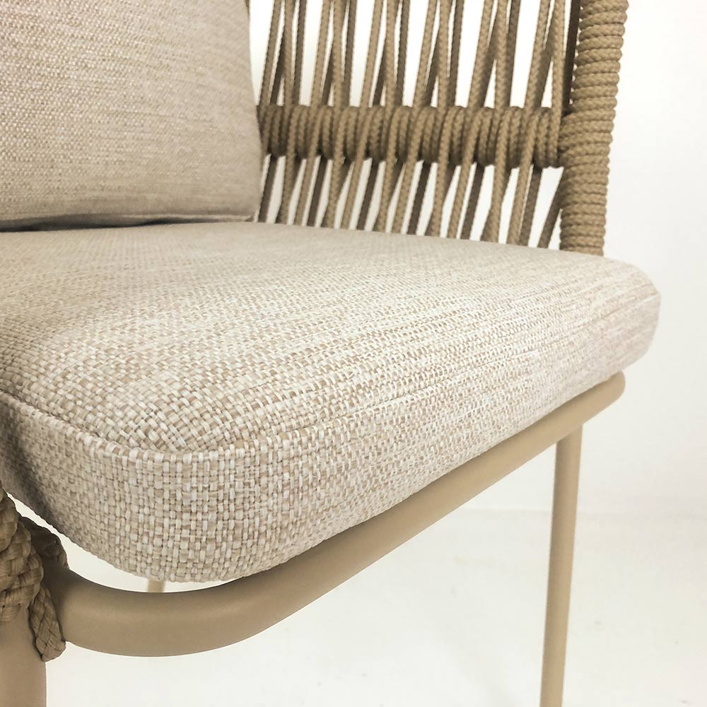 A poltrona de jantar Cliff possui uma estrutura feita de corda sintética bege e almofadas em tecido 100% PP com capas removíveis na mesma cor, acolchoadas com espuma seca.