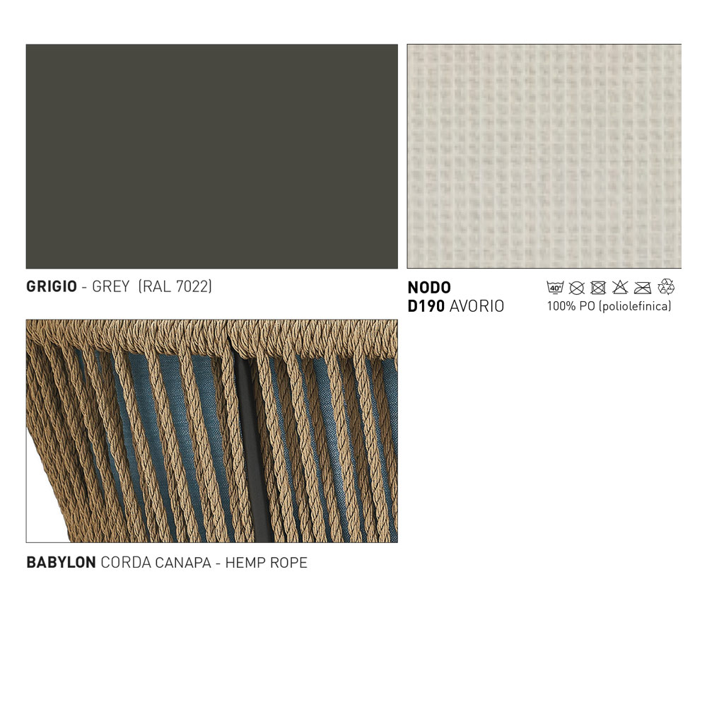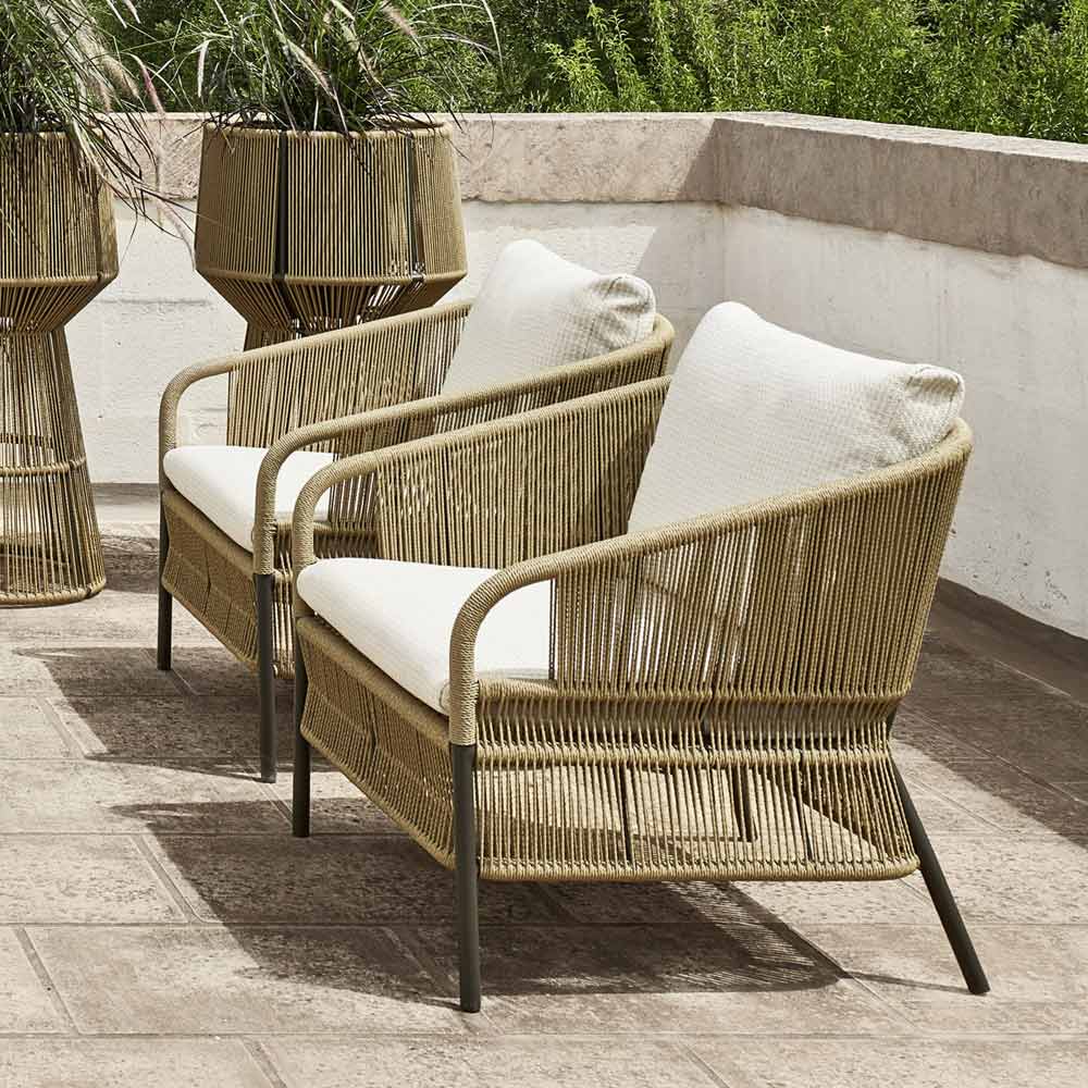 Poltrona de exterior com estrutura em alumínio revestido a pó com acabamento cinzento , assento tecido à mão em corda cor de cânhamo e duas almofadas cor marfim com estofamento dryfeel incluído. Uma solução de mobiliário inovadora e fresca, enriquecida pelos maravilhosos acabamentos propostos que transformam o ambiente exterior com requinte.