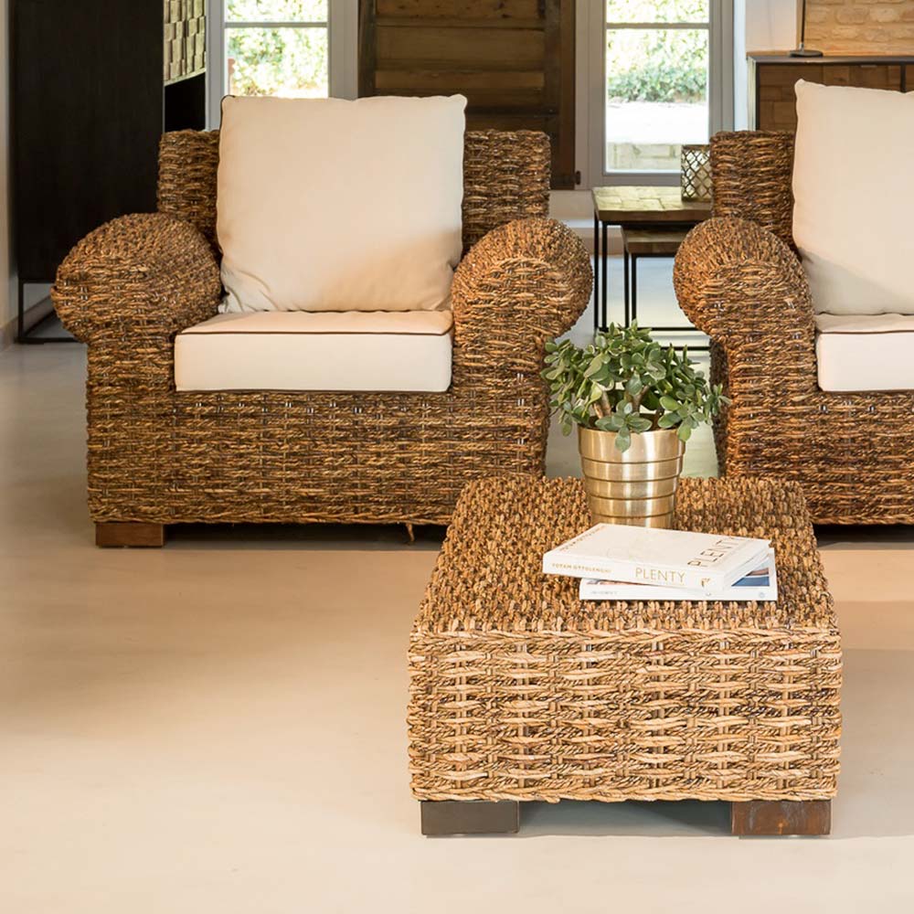 A cadeira de braços pertence a toda uma coleção que se torna única pelos apoios de braços cilíndricos arredondados e uma refinada trama densa de fibra natural abaca, derivada da bananeira . Os assentos são grandes e estão equipados com almofadas confortáveis.