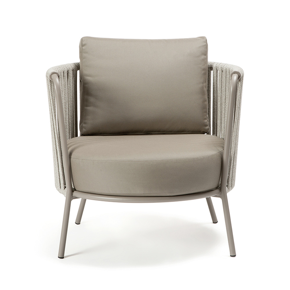 resistência do acabamento do material aos agentes atmosféricos corrosivos, enquanto a corda é resistente ao cloro e à luz solar, além de ser antimofo. As almofadas são feitas de material resistente aos raios UV e à água, que mantém a cor por muito tempo, tornando a poltrona um elemento perfeito para mobiliar qualquer ambiente externo.
