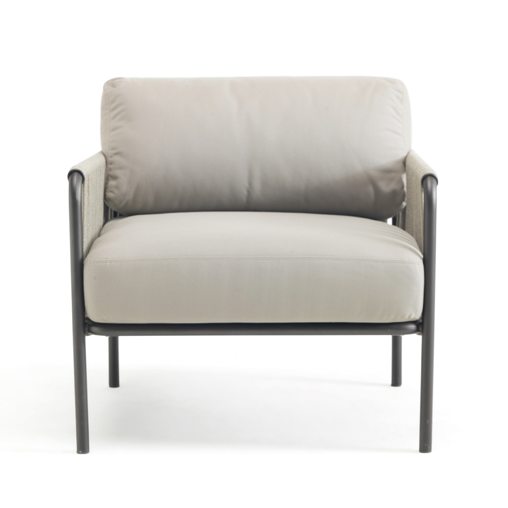 Observação : A poltrona, a corda e as almofadas estão disponíveis em uma ampla gama de cores. Os apoios de braços são removíveis.