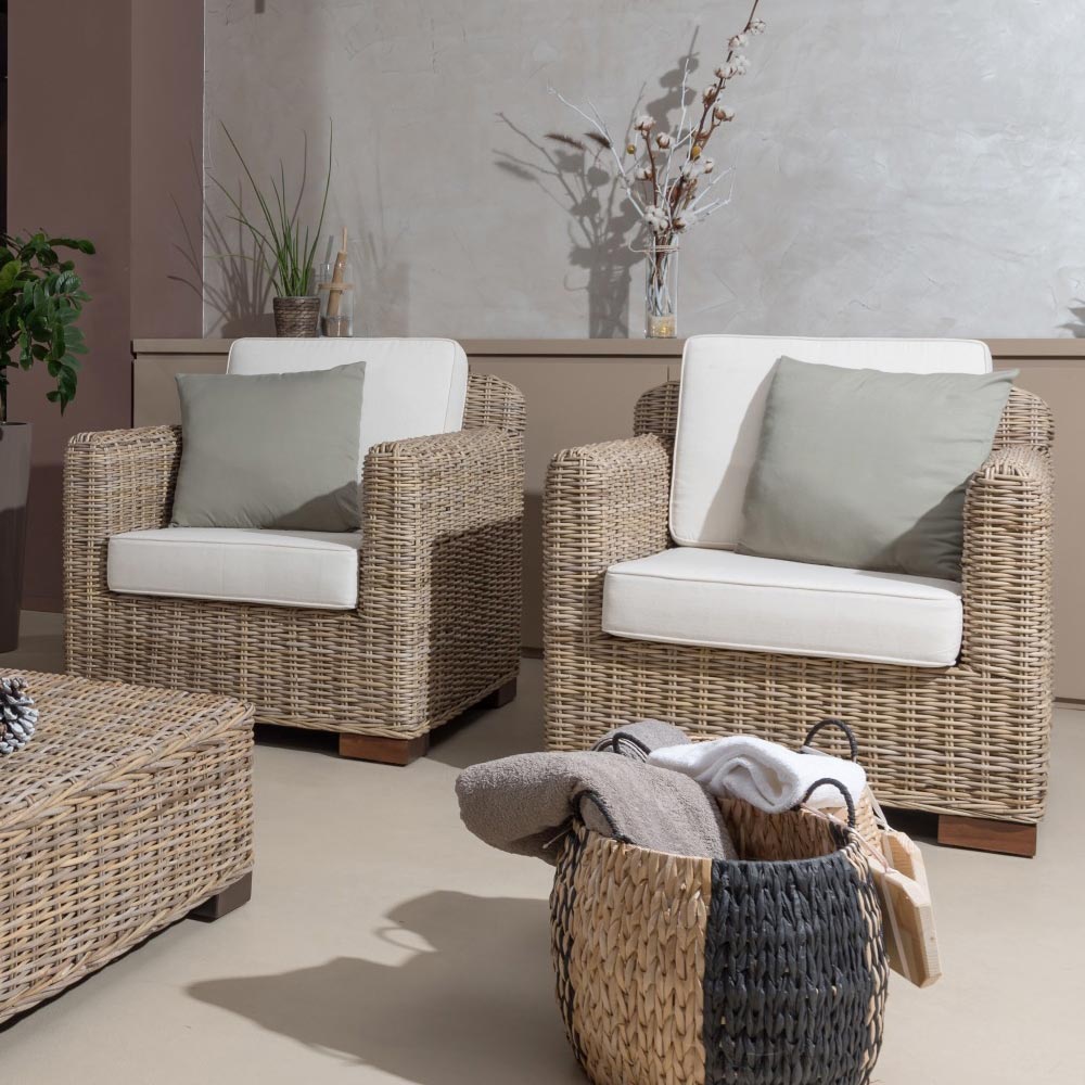 Cadeirão de exterior fabricado em kubu cinzento tecido à mão com almofadas standard incluídas no acabamento standard " Ecru ". O Kubu é um dos materiais naturais mais resistentes encontrados na natureza, mas permanece sempre muito leve.