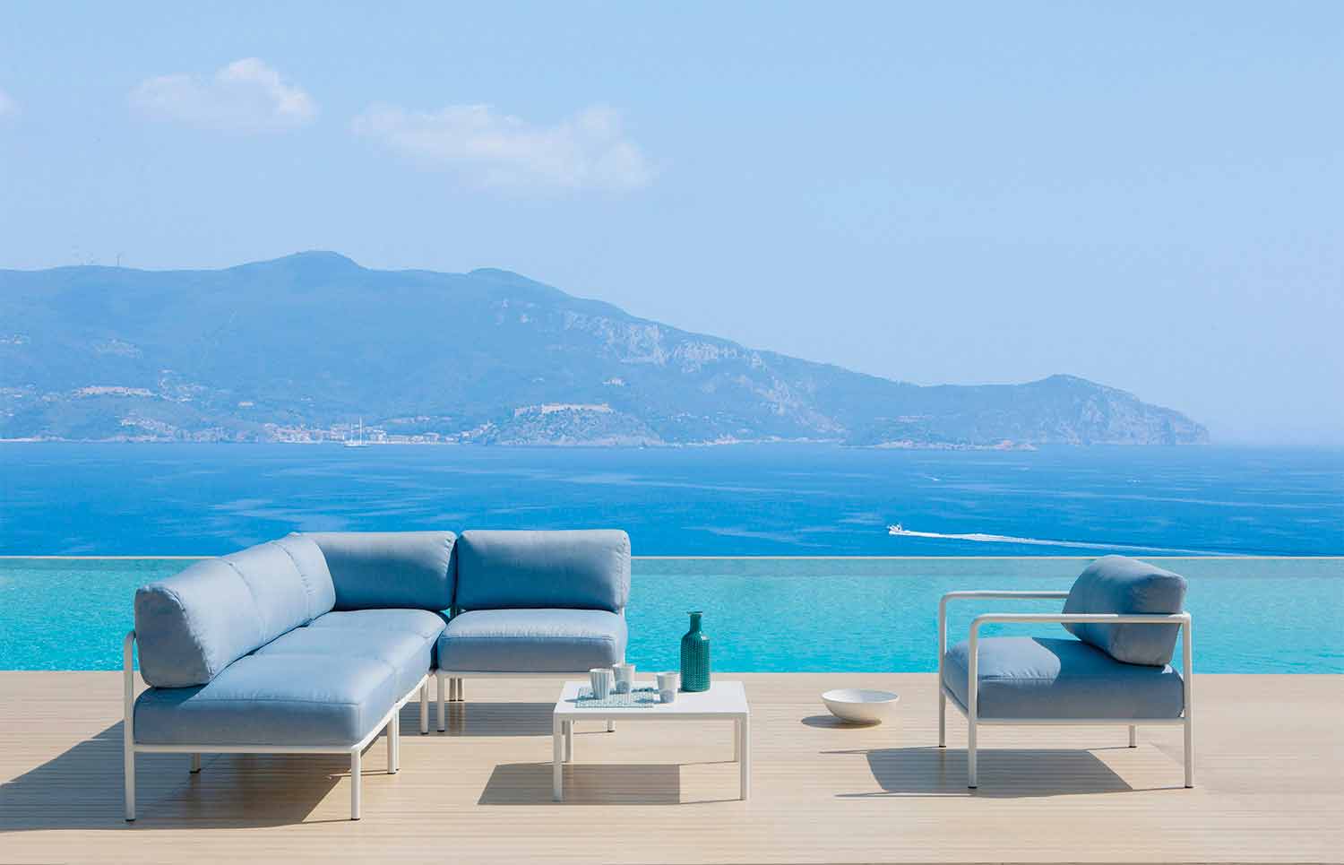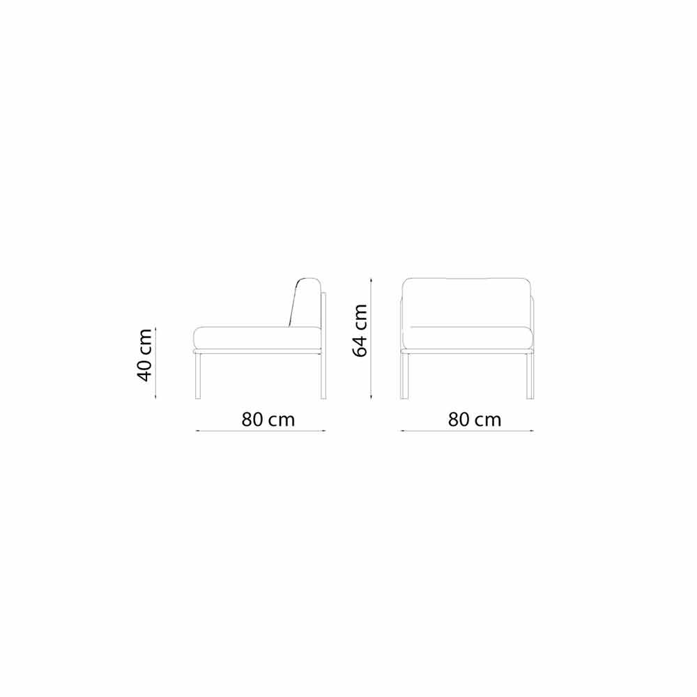 Poltrona central modular para área externa, em ferro galvanizado com pintura eletrostática e tecido com design Made in Italy.
