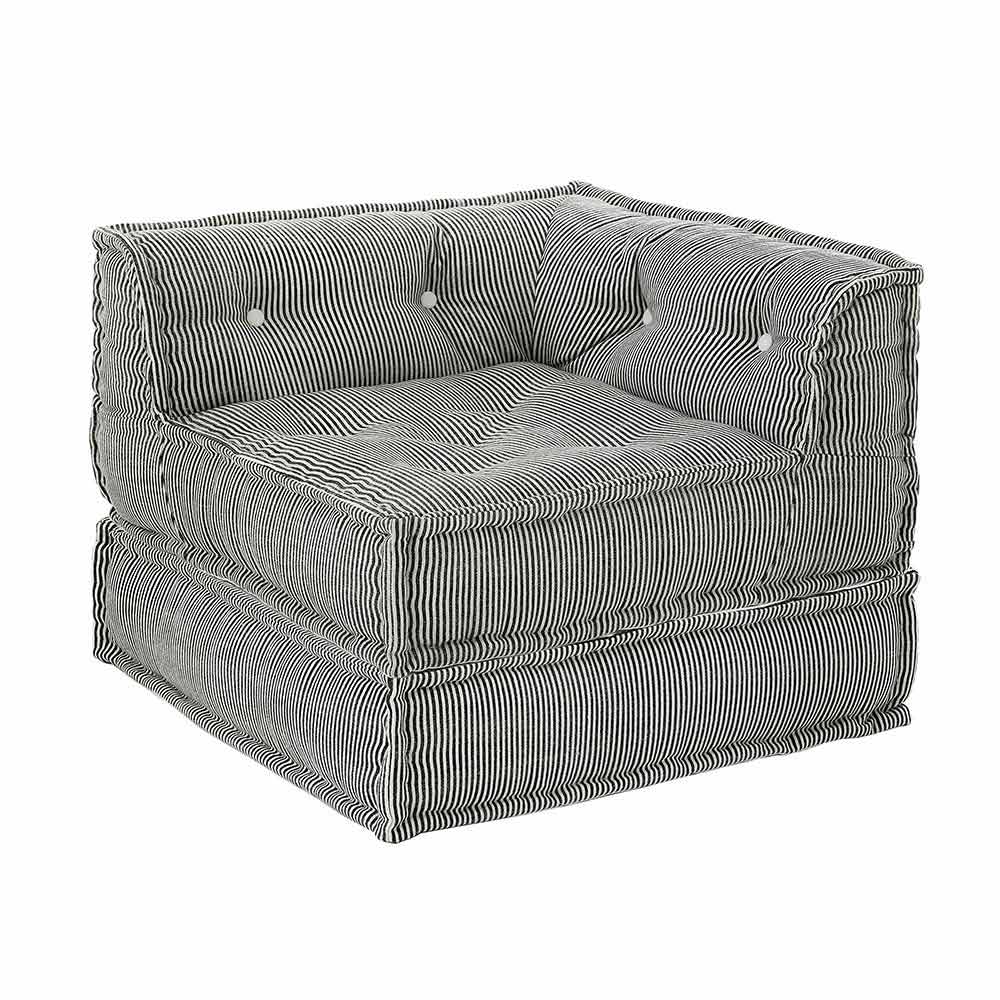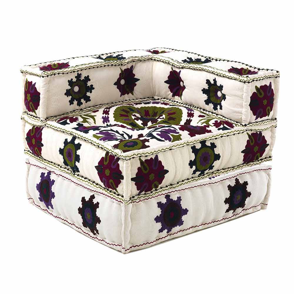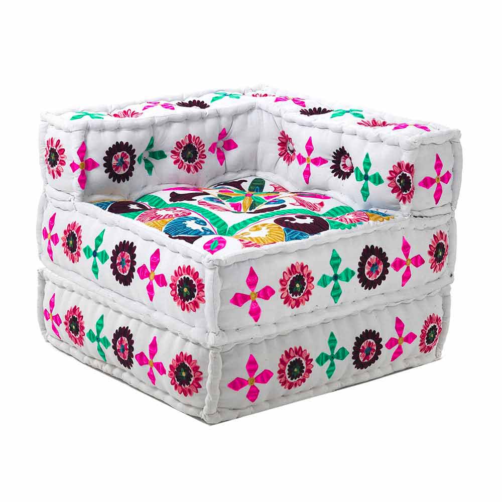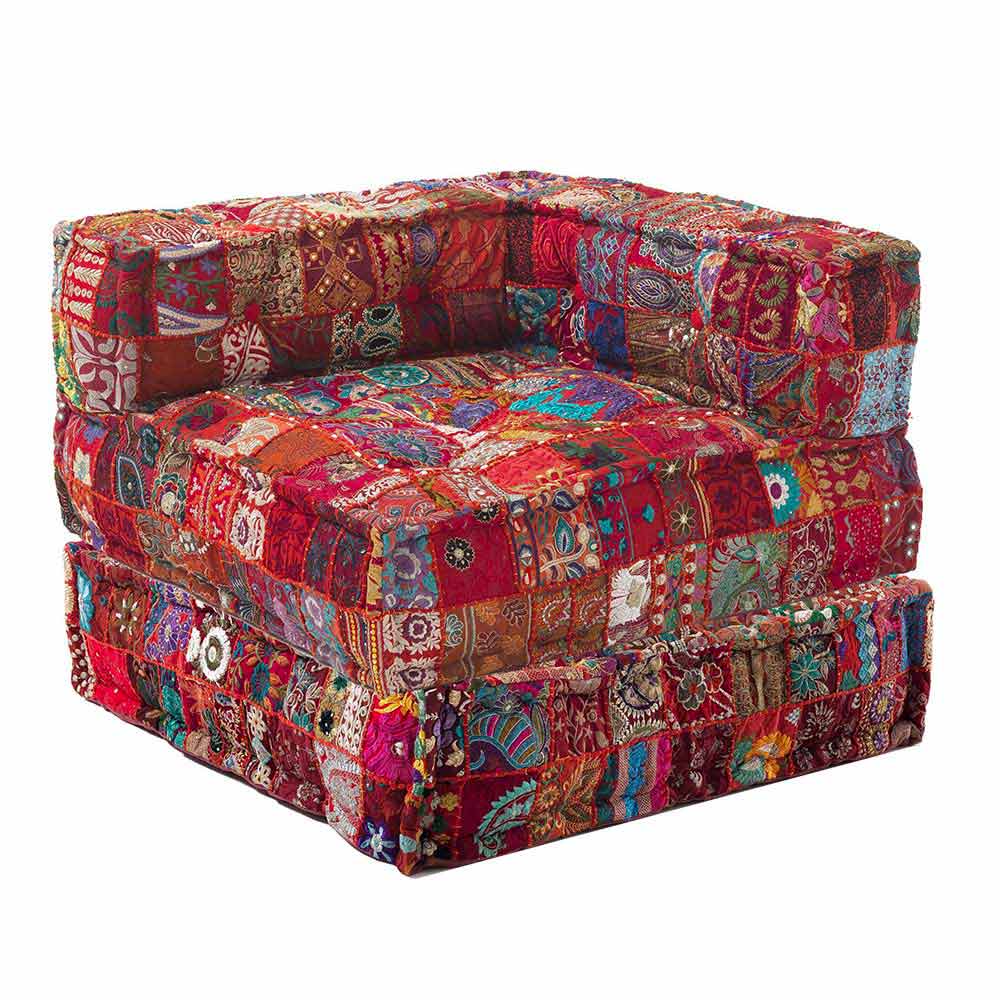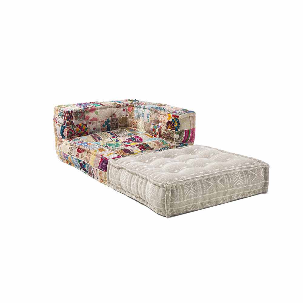 Poltrona de chaise longue de design étnico em algodão colorido de retalhos.