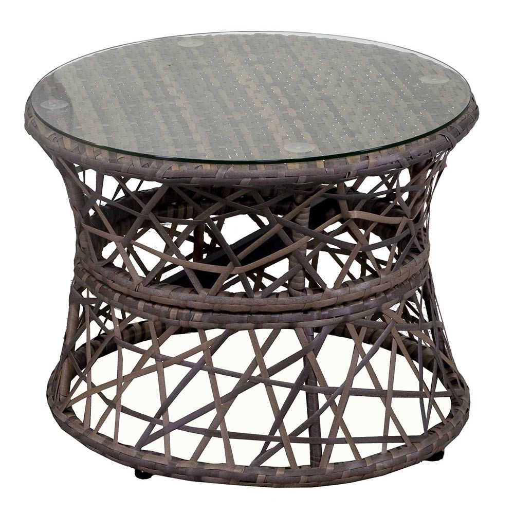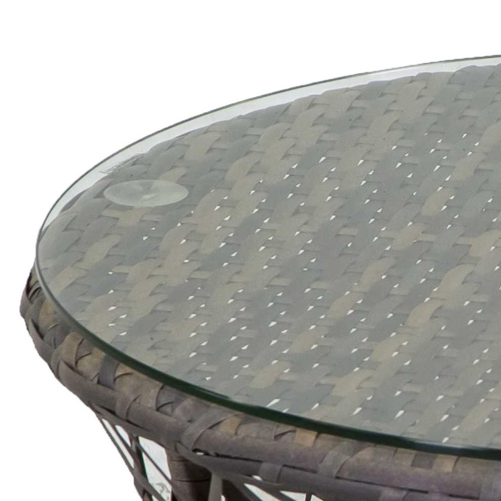 A mesa de café a condizer apresenta um tampo de vidro, ideal para manter bebidas, livros ou decorações ao alcance. A sua forma redonda e tamanho compacto tornam-na versátil e fácil de colocar ao lado da poltrona ou em qualquer canto do seu jardim ou terraço.