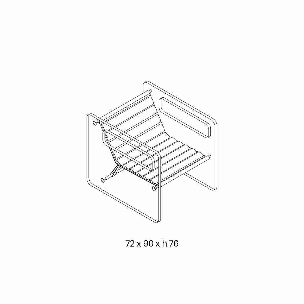 A estrutura é composta de duas lâminas de vidro temperado com duas aberturas que tornam os braços confortáveis e práticos.