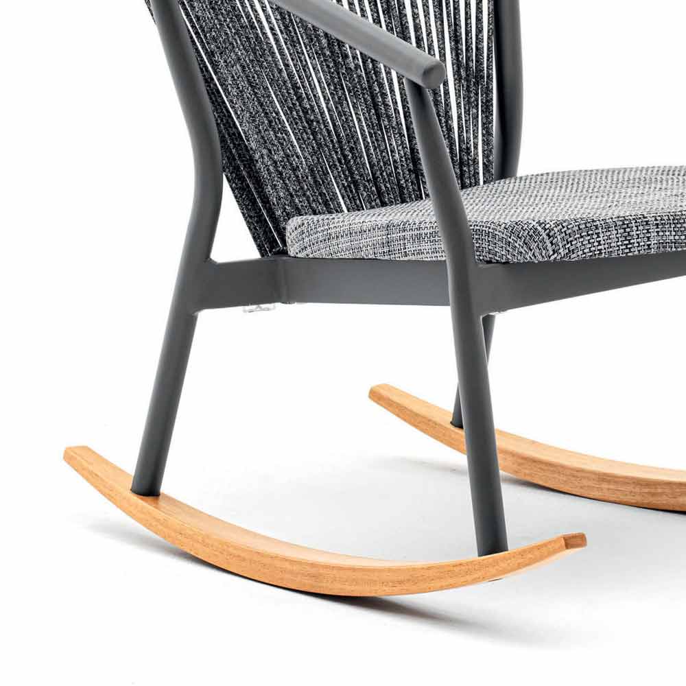 Poltrona de balanço de design moderno para exterior com base em madeira maciça e assento em tecido técnico colorido branco ou cinza.