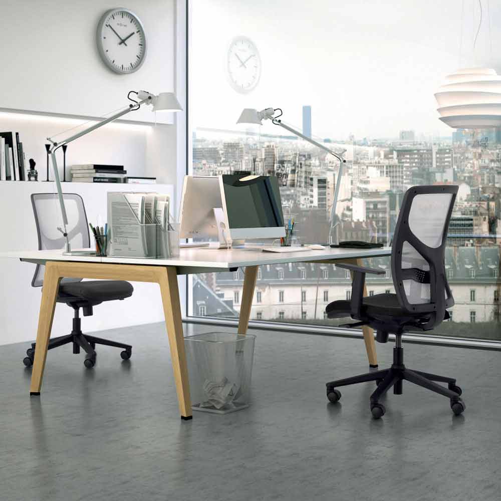 Equipado com um mecanismo sincronizado de encosto / assento em aço de duas alavancas, com 4 posições de bloqueio, ajuste da tensão da mola para ajuste da oscilação por meio de um manípulo e sistema de segurança de encosto anti-choque.