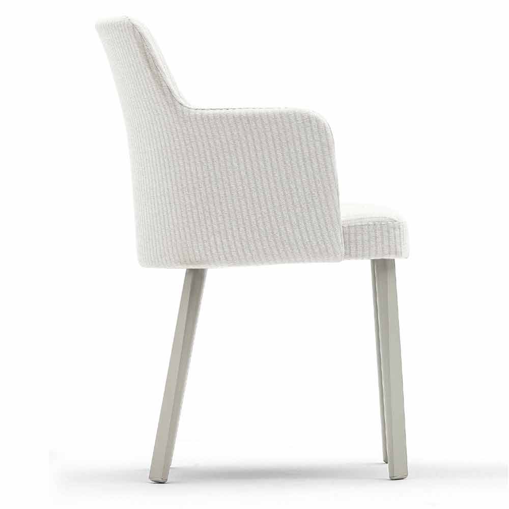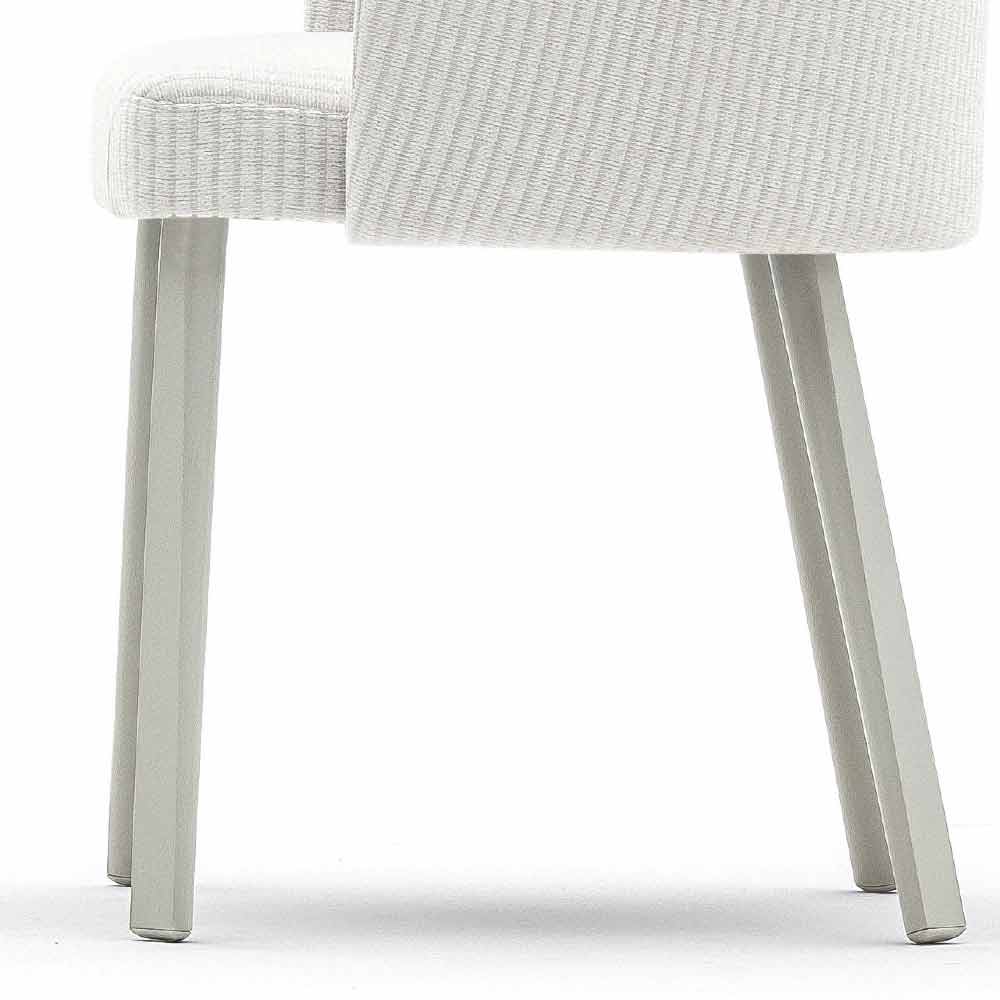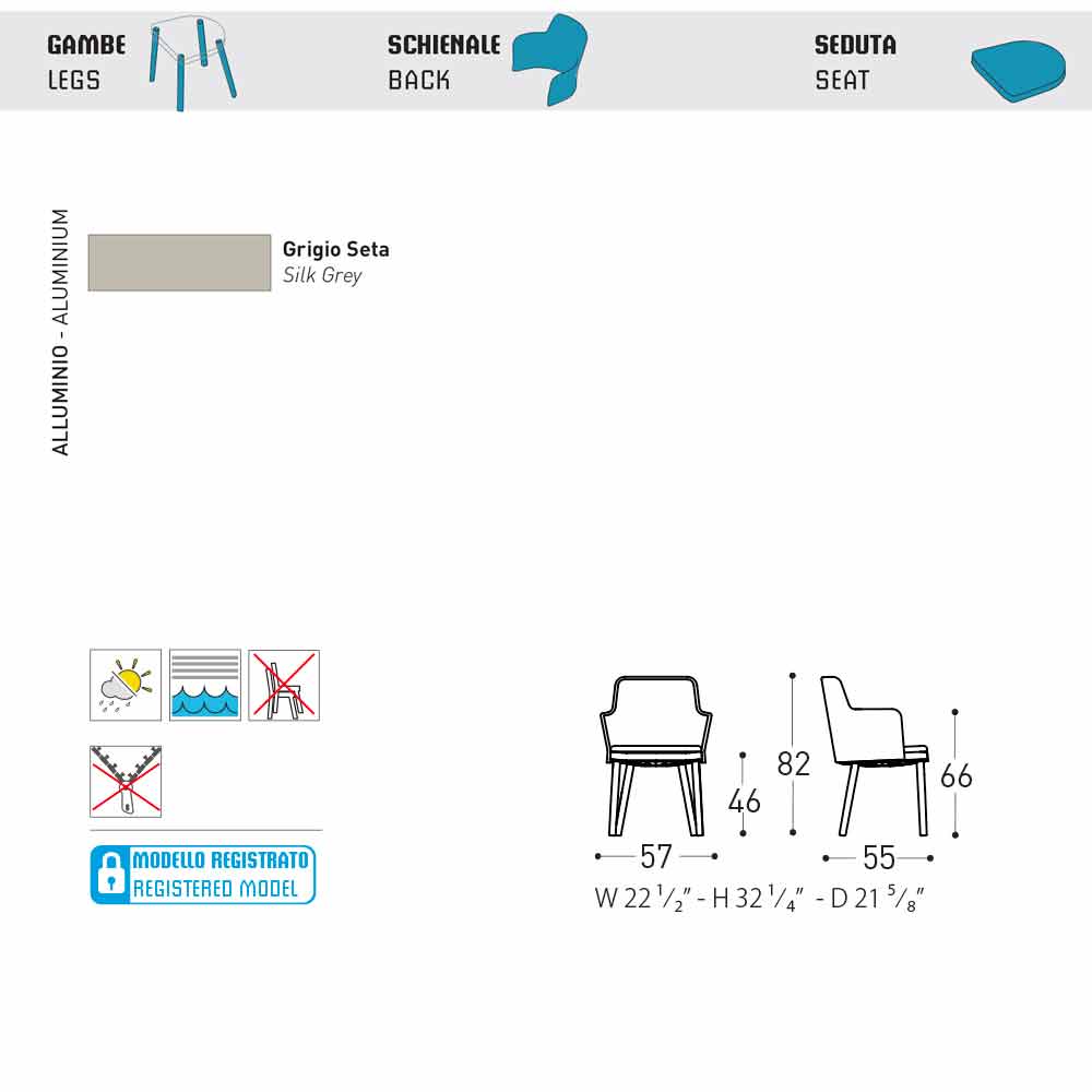 Ele também vem com pernas de alumínio pintadas em cinza de seda e um assento estofado em tecido com estrutura de assento de polipropileno.