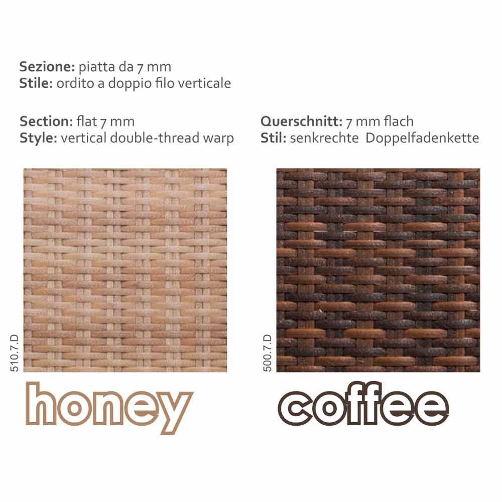 Poltrona de jardim com estrutura de alumínio coberta com polietileno plano de 7 mm de espessura, disponível nas tonalidades de café ou mel.