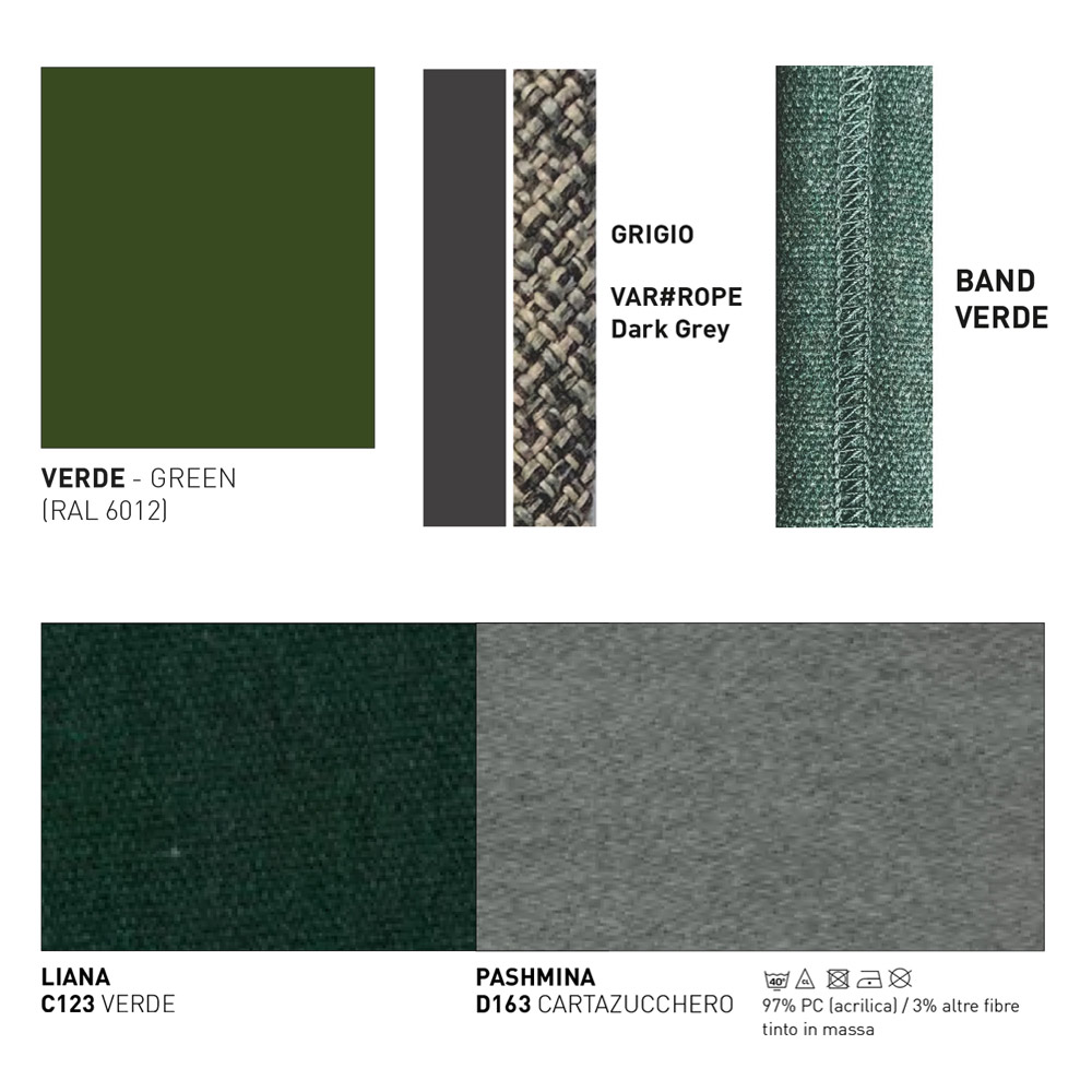 - perna verde, estrutura cinza, tecido e assento verde, almofadas de costas verdes e papel açucarado.