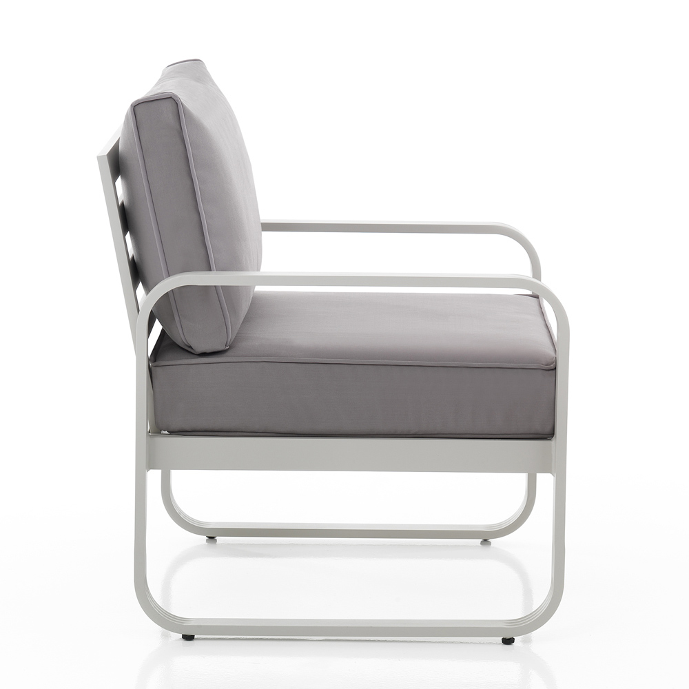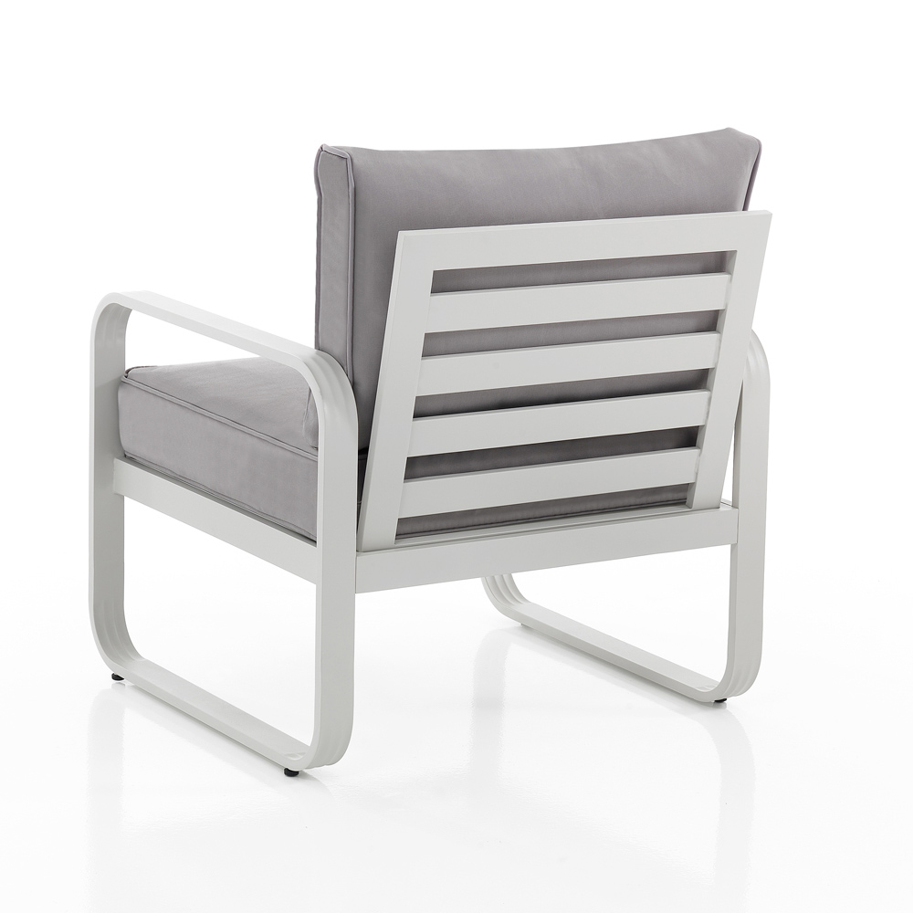 Esta poltrona é o emblema do conforto minimalista para espaços exteriores . As suas linhas limpas e estrutura em alumínio oferecem uma estética moderna e cativante que se adapta com versatilidade tanto a jardins modernos como a terraços de estilo mais clássico.