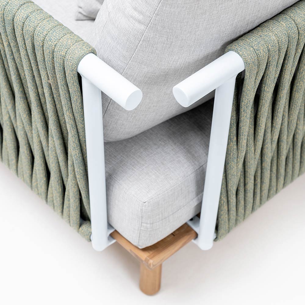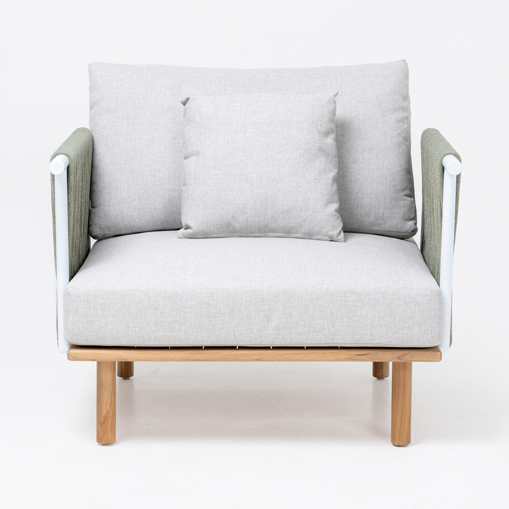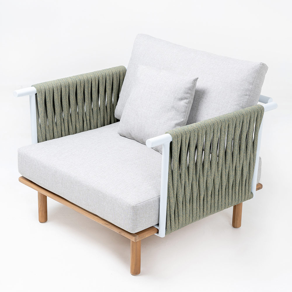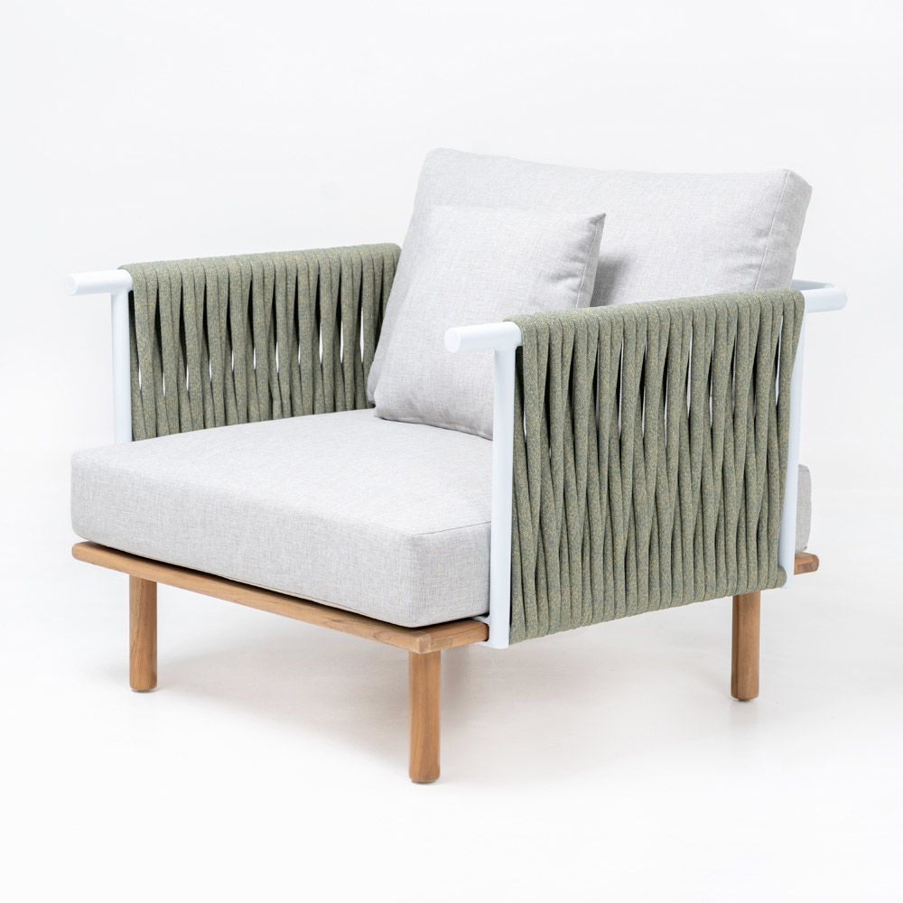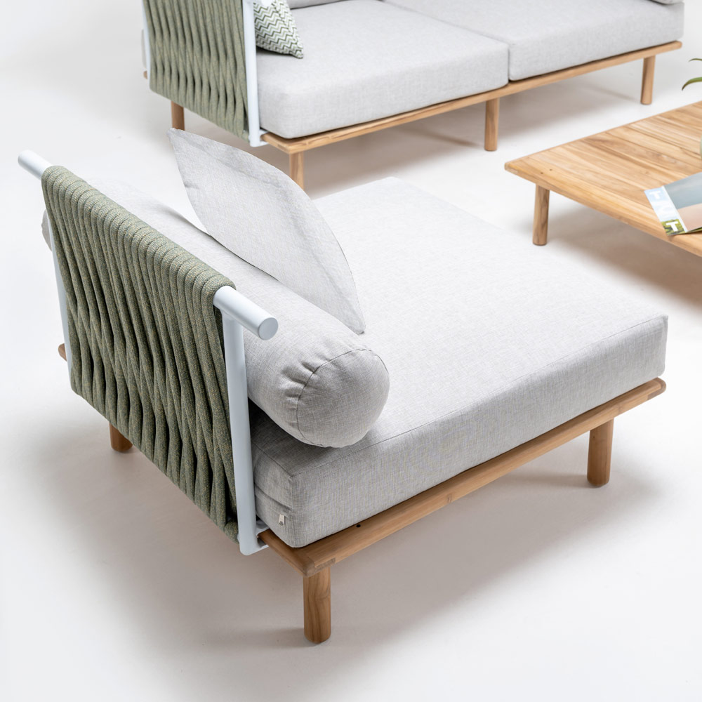 Cadeirão de jardim em teca, encostos em alumínio e trama e almofada em Olefin/PP ROPE