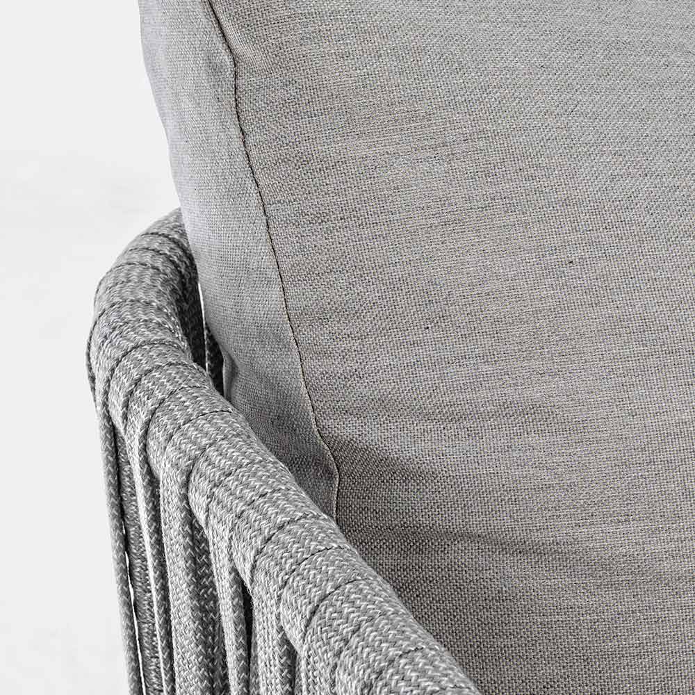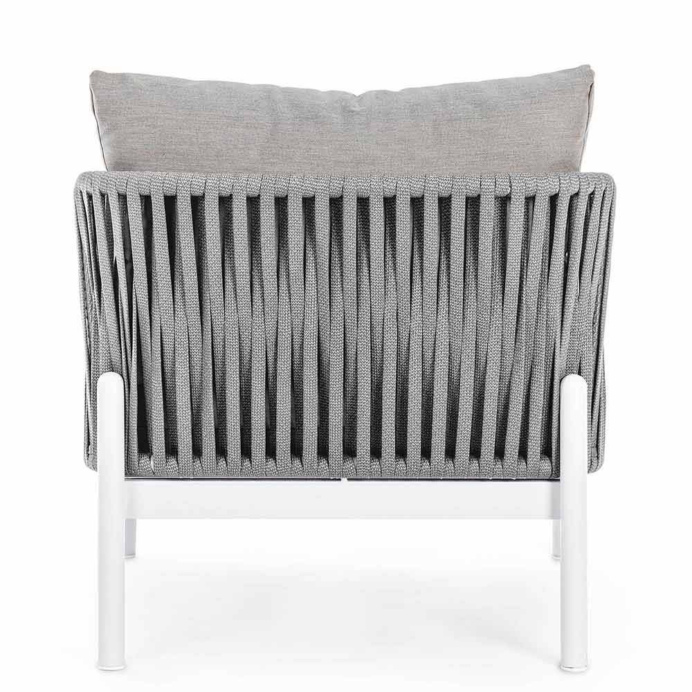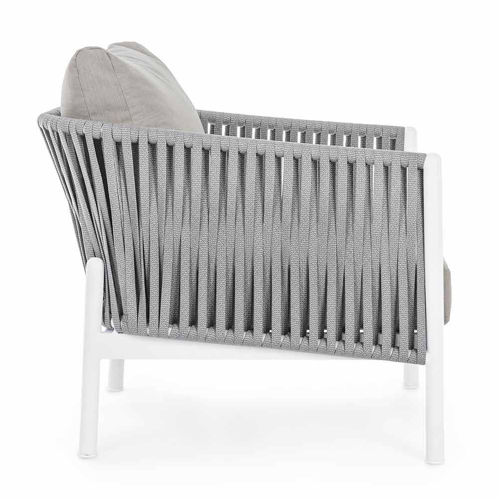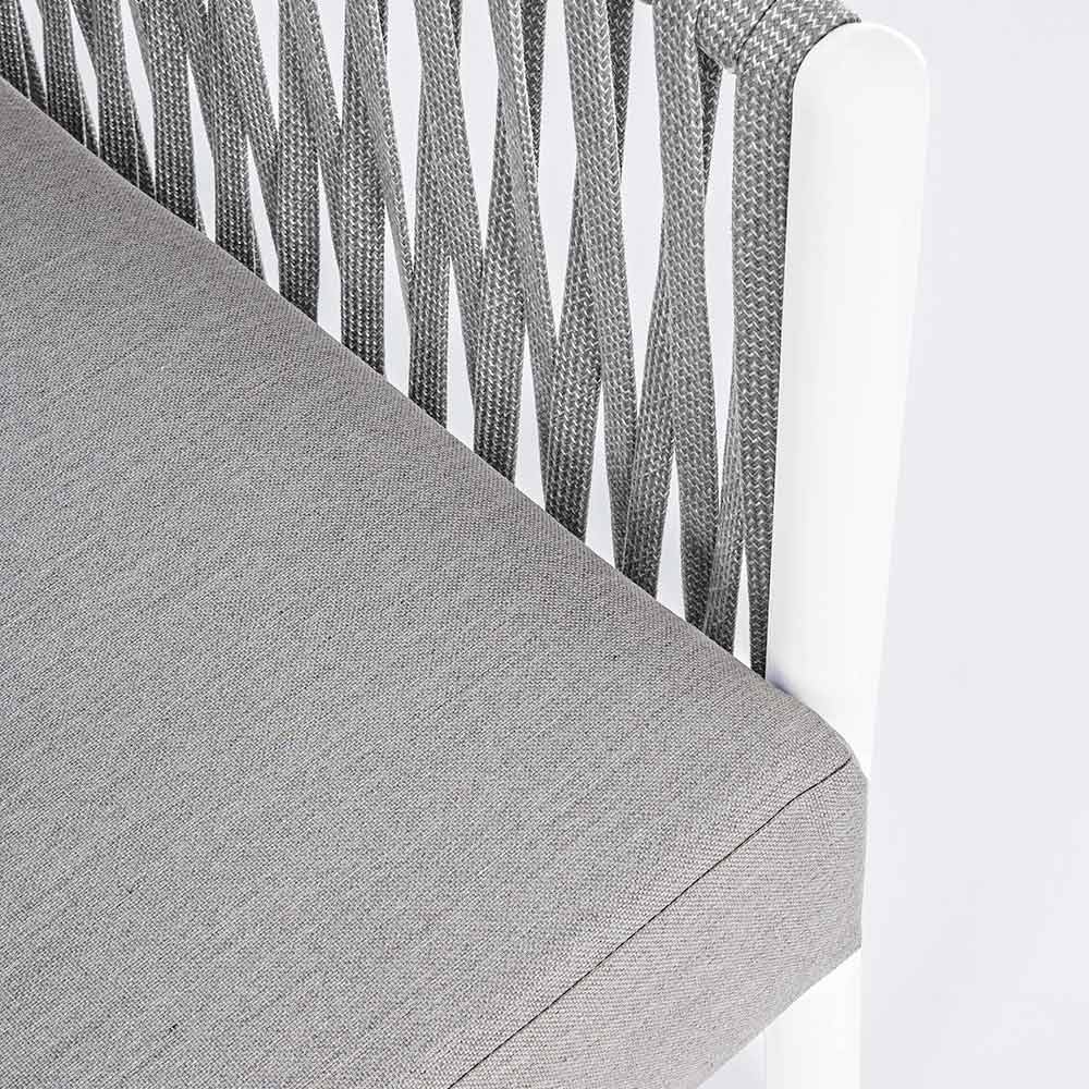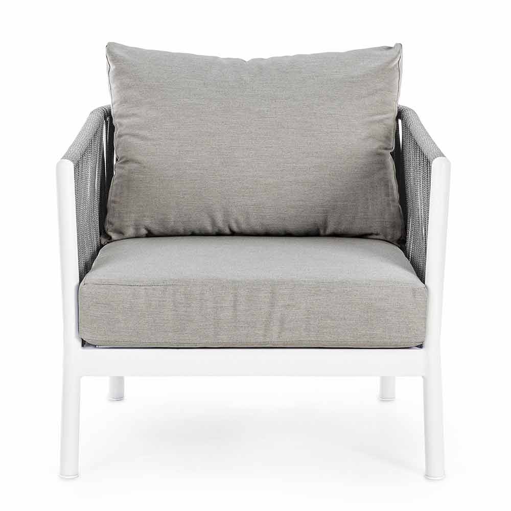 Poltrona de design ao ar livre com estrutura de alumínio branco e almofadas removíveis.