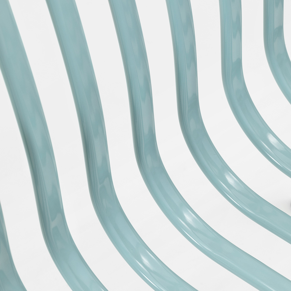 trama de arame com formas ovais verticais que seguem harmoniosamente e sinuosamente as formas ergonômicas da estrutura, adaptando-se melhor à silhueta do corpo para oferecer