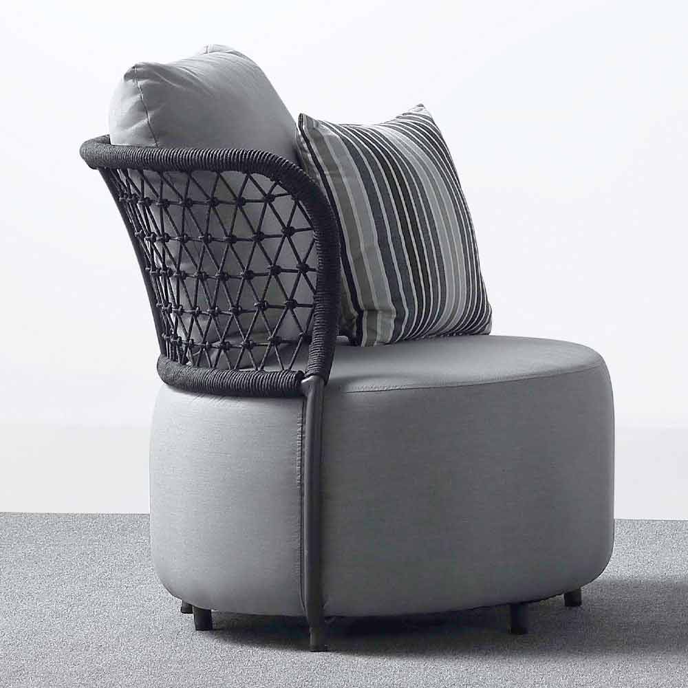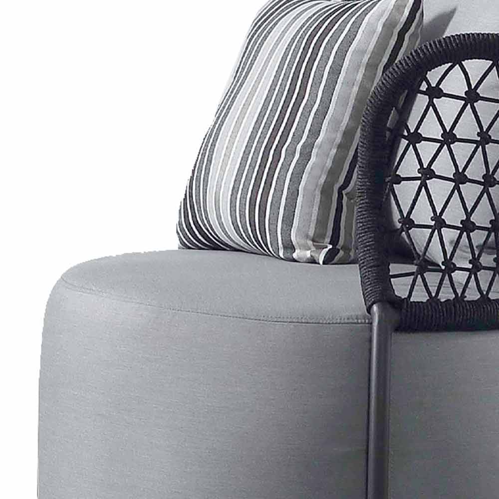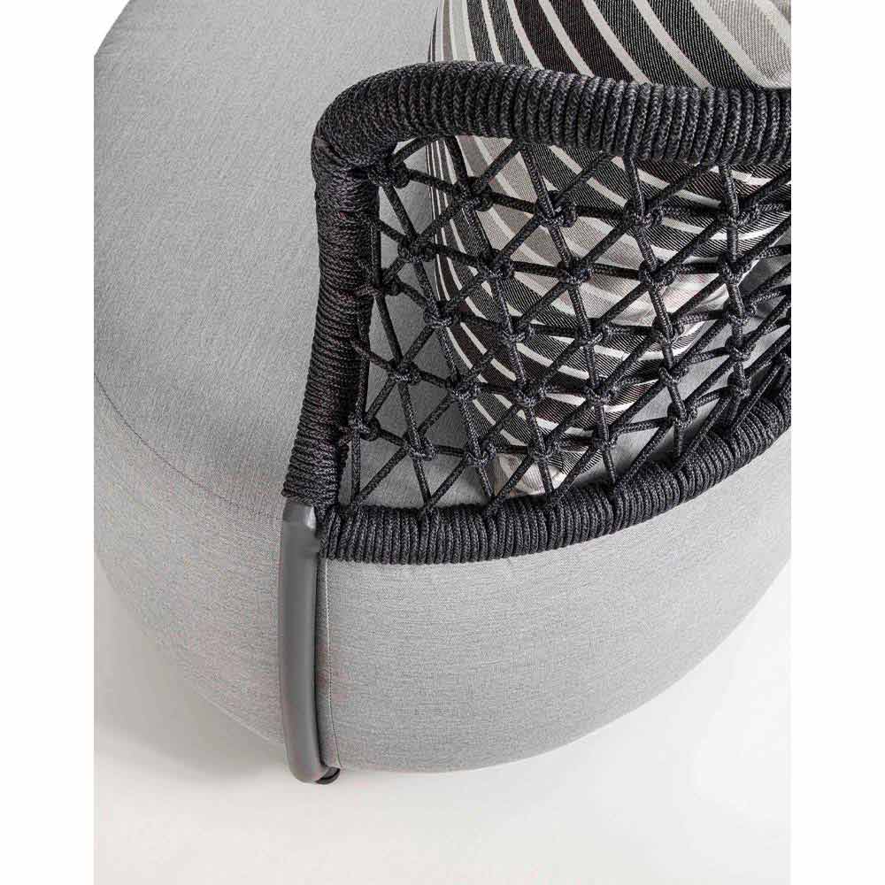 Poltrona exterior em tecido cinzento com estrutura em rede e alumínio.