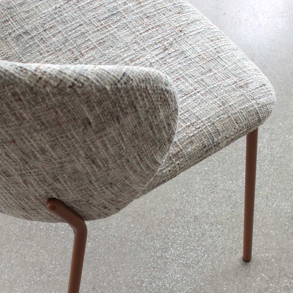 Fabricado na Itália. Poltrona com design moderno, definida por linhas suaves que garantem conforto e versatilidade. Caracteriza-se por um revestimento disponível em inúmeras variações de cores e materiais, que lhe permitem adaptar-se a diferentes estilos de mobiliário. As pernas metálicas com revestimento em pó sustentam um corpo estofado, com costuras combinando que contribuem para o design limpo e elegante do produto. Esta coleção é ideal para quem procura elementos de mobiliário com design contemporâneo que não comprometam o conforto.