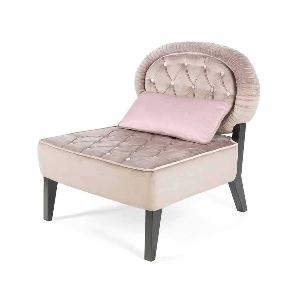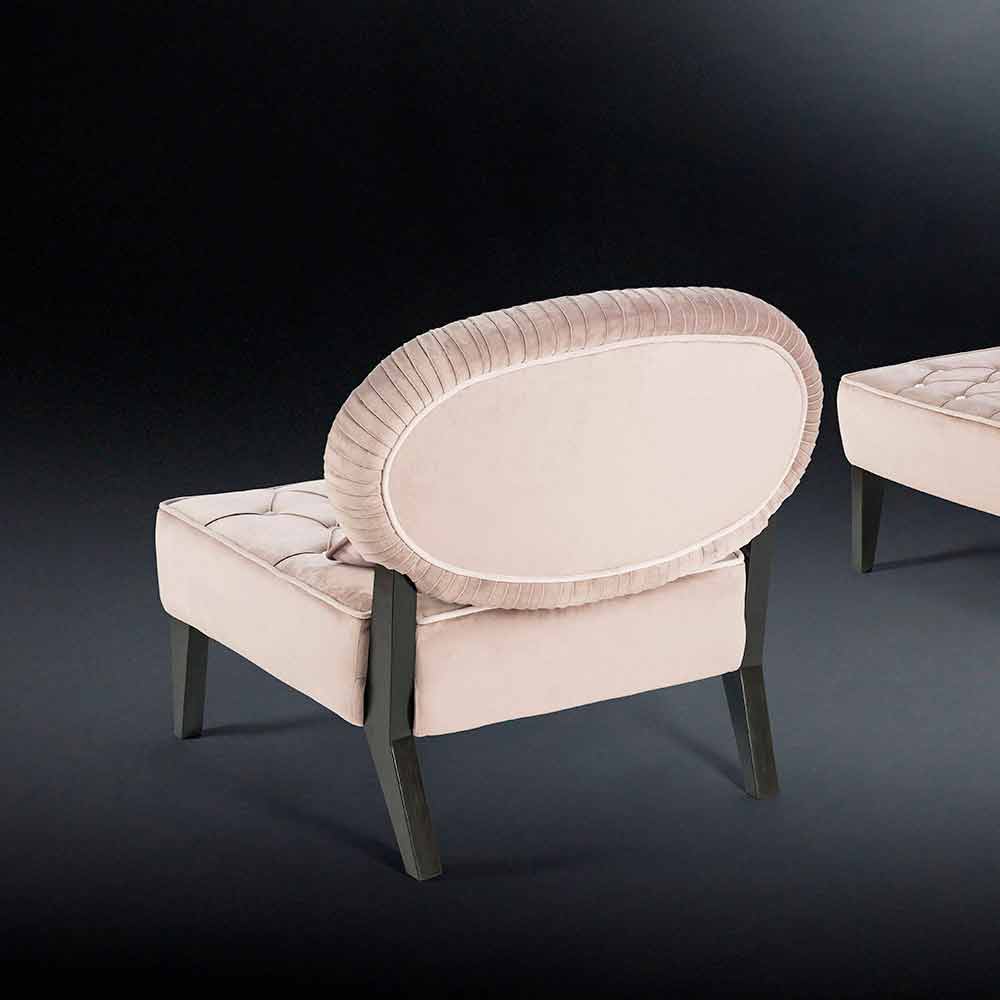 Poltrona de veludo Elizabeth, com estofos abotoados, fabricada na Itália.