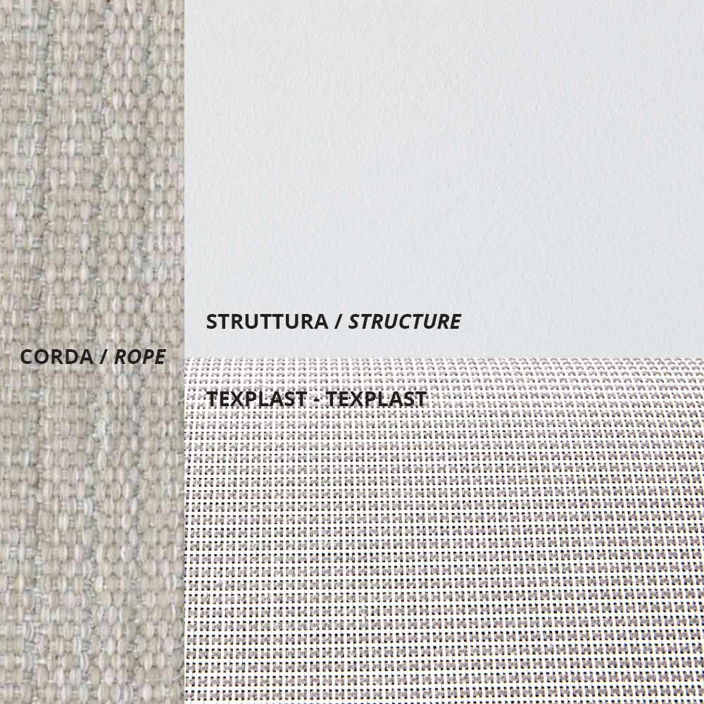 - Estrutura: branco em relevo + Corda: lama + Almofadas: branco sensível