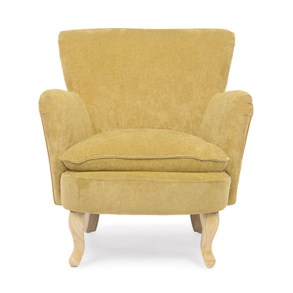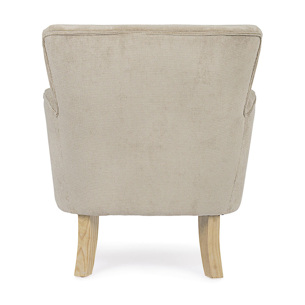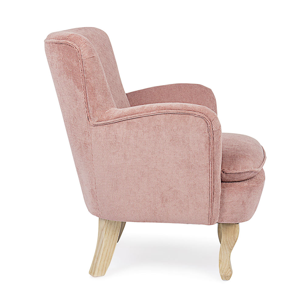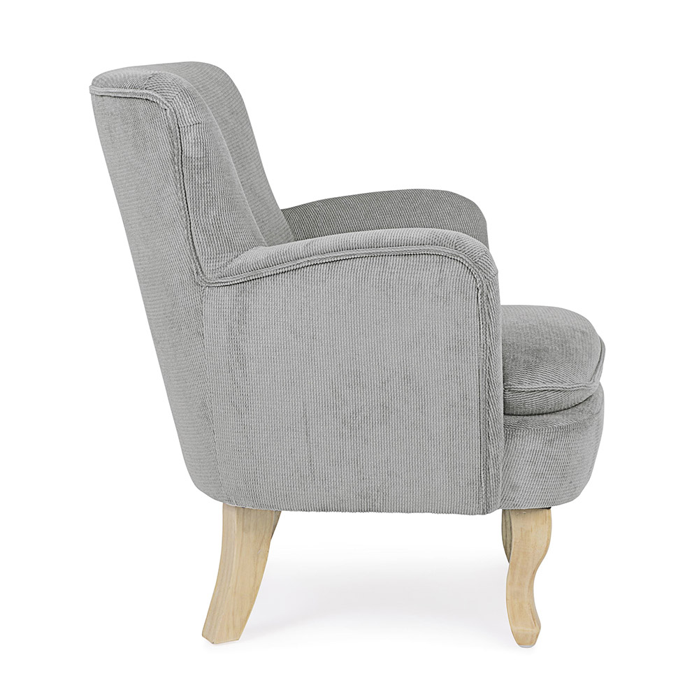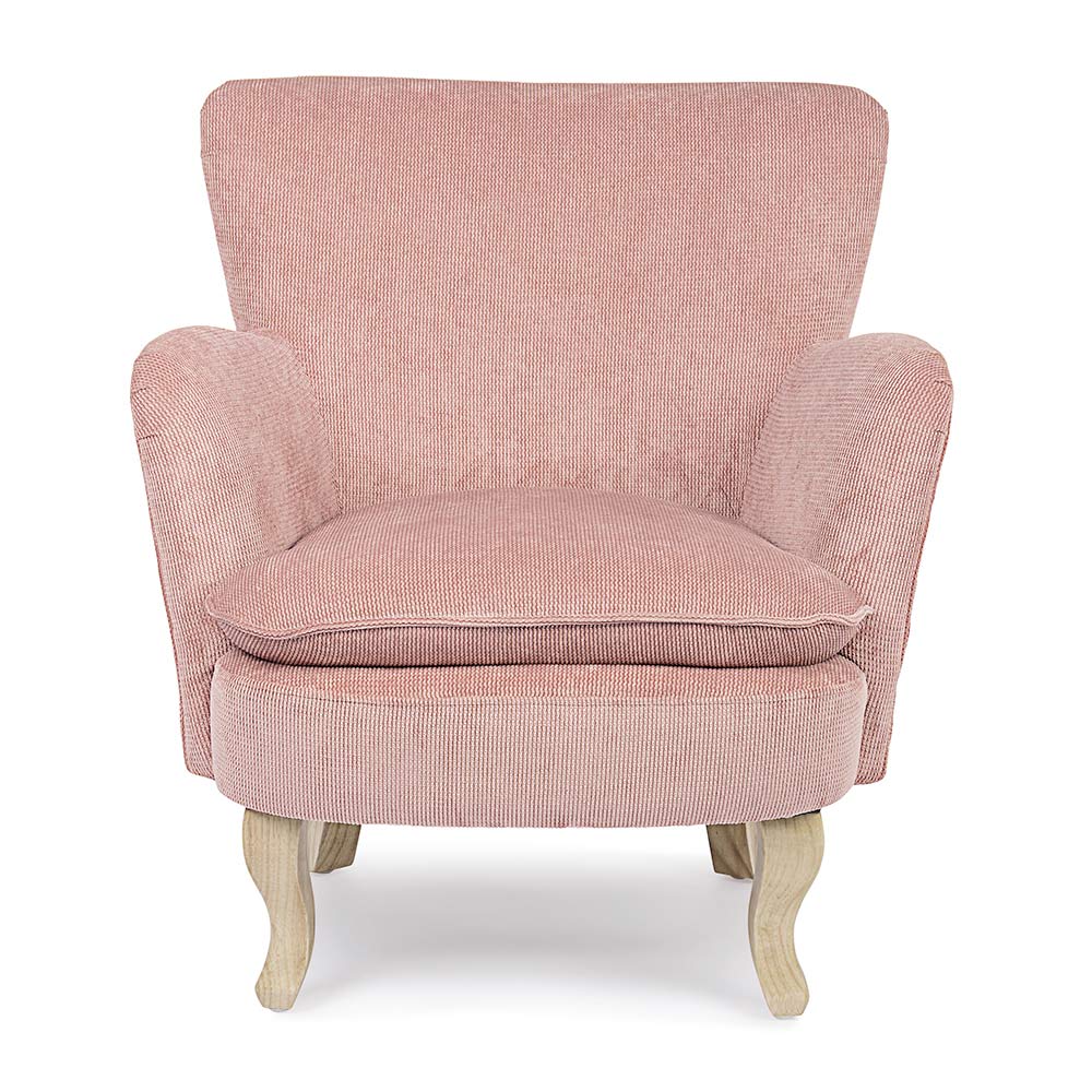 Poltrona em pinho e borracha e assento estofado com efeito veludo cotelê em 4 acabamentos.