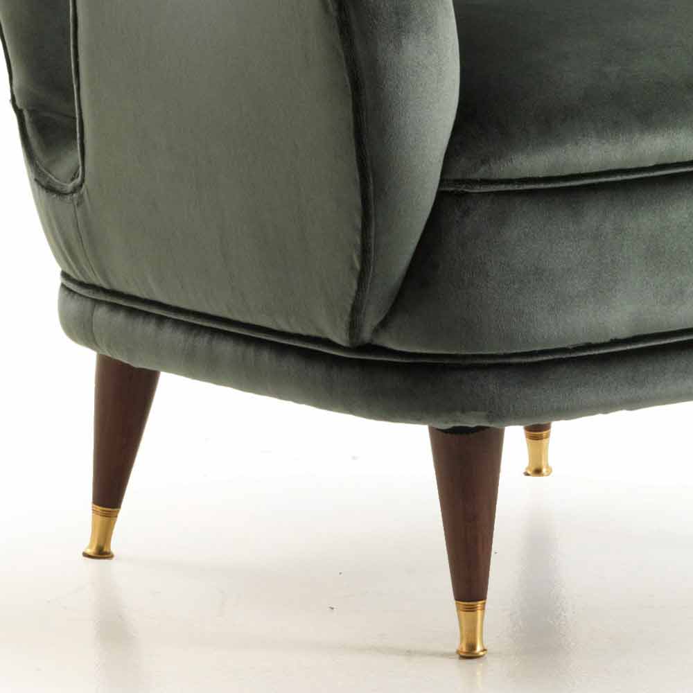Poltrona estofada com ponteiras em latão patinado. Benny é inspirado nas poltronas do quarto do passado, das quais ele emprestou as formas sinuosas e sensuais e os pés finos e afilados de madeira. A almofada do banco, posicionada a uma altura reduzida, é composta por um acolchoamento espesso, bem como o encosto alto e largo e os dois braços, proporcionando uma extraordinária experiência de conforto. A forma das costas lembra as proporções de curvas muito femininas, delineando uma cintura fina que se alarga para cima. Terminar em nogueira americana escura.