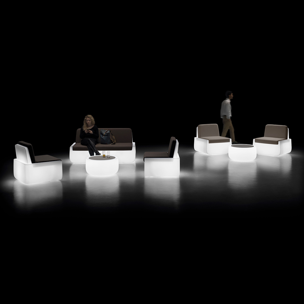 poltrona de exterior é caracterizada por linhas suaves e um assento largo e profundo que é particularmente confortável. Graças à iluminação com luz LED, o produto é realçado por uma luz suave que cria um ambiente acolhedor adequado para mobiliar áreas de relaxamento ao ar livre.