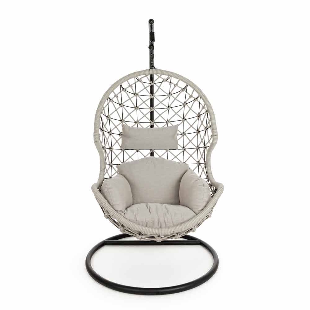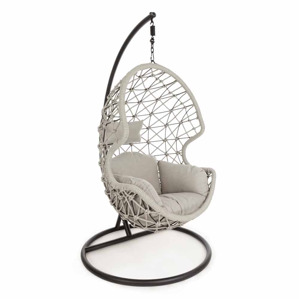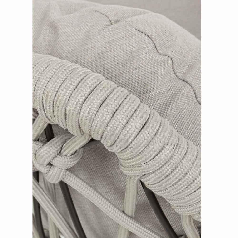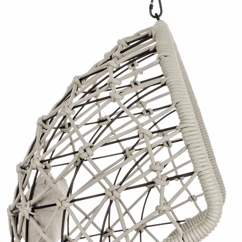Poltrona exterior suspensa em aço e corda com almofadas removíveis.