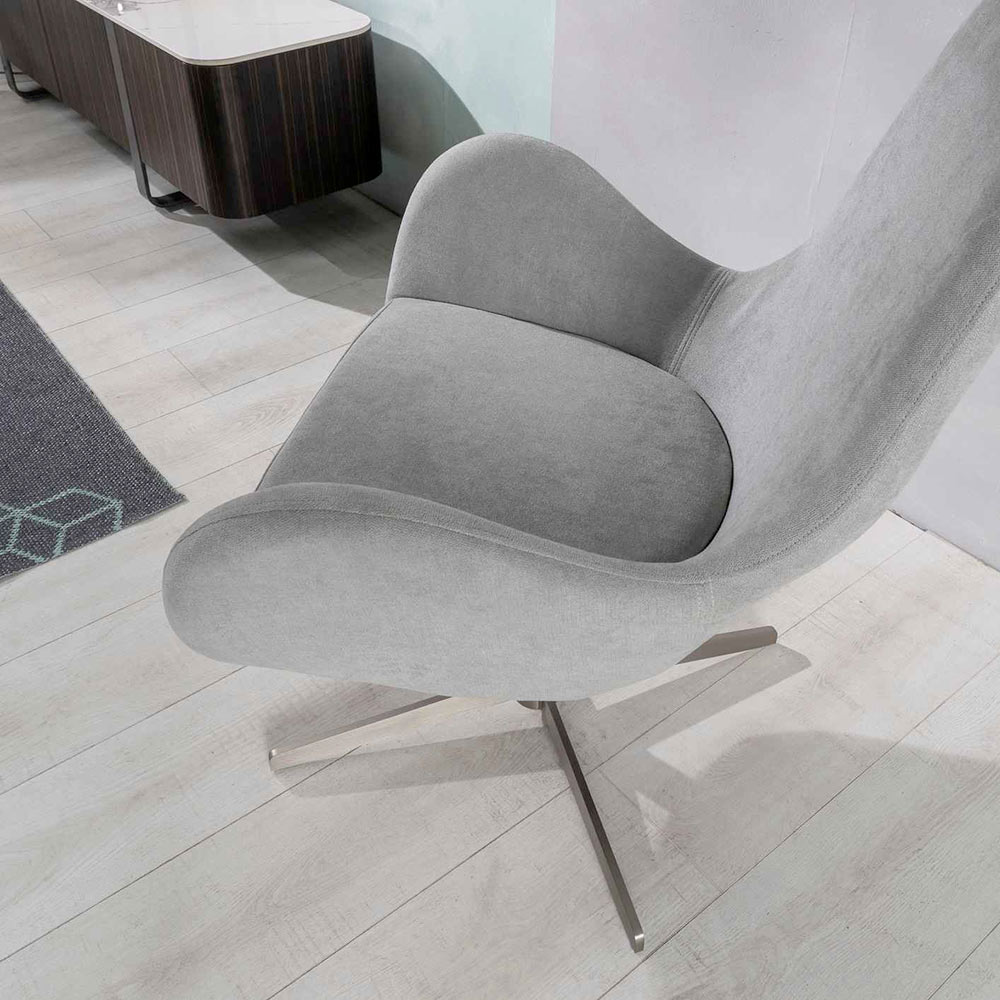 Um espaço para relaxar com estilo. Esta poltrona giratória tem uma silhueta evocativa, que comunica facilmente com mobiliário de estilo moderno e contemporâneo. Seu design transmite um charme que nunca desaparece, um formato atemporal, macio e sinuoso. O conforto surpreendente é garantido pelo assento em tecido acolchoado.