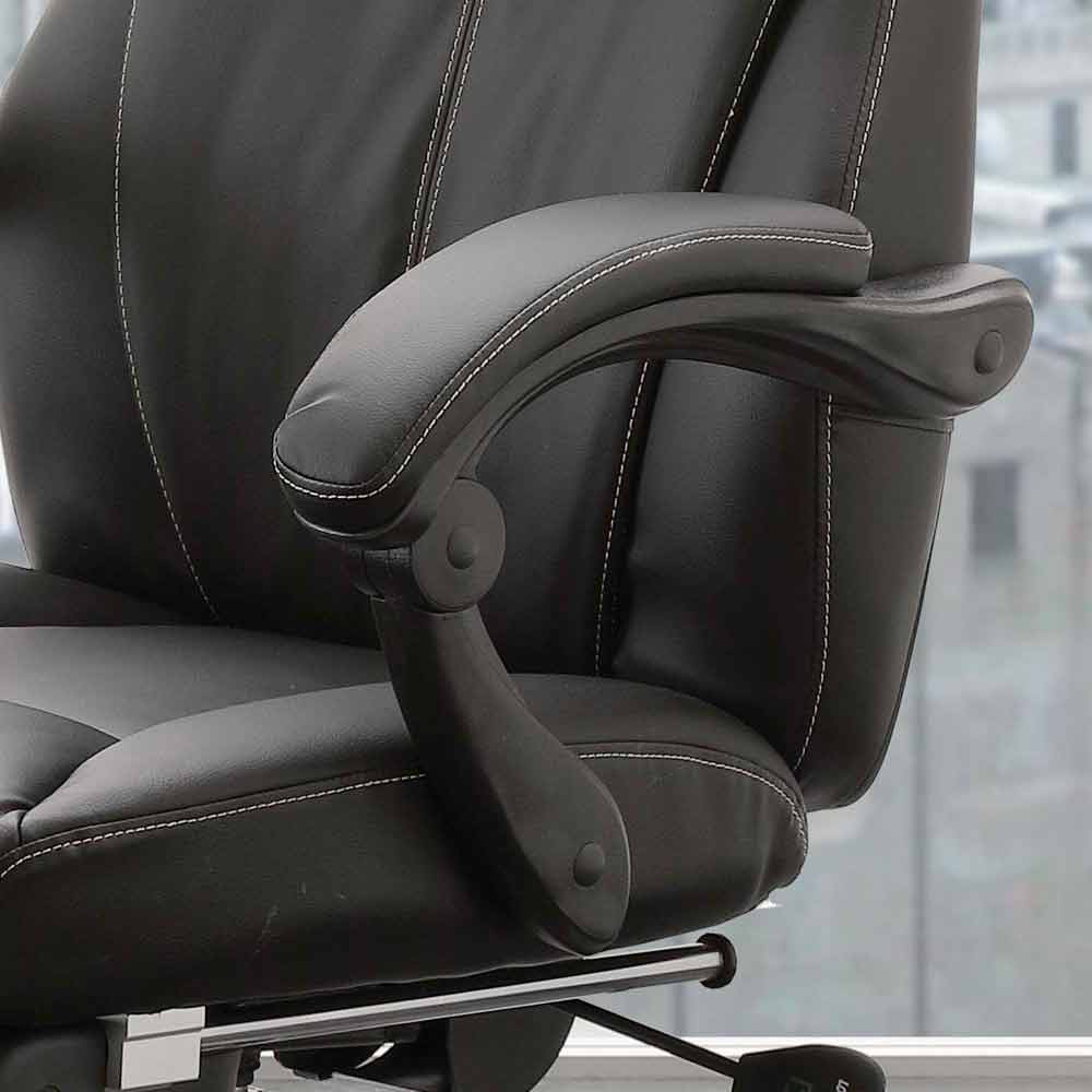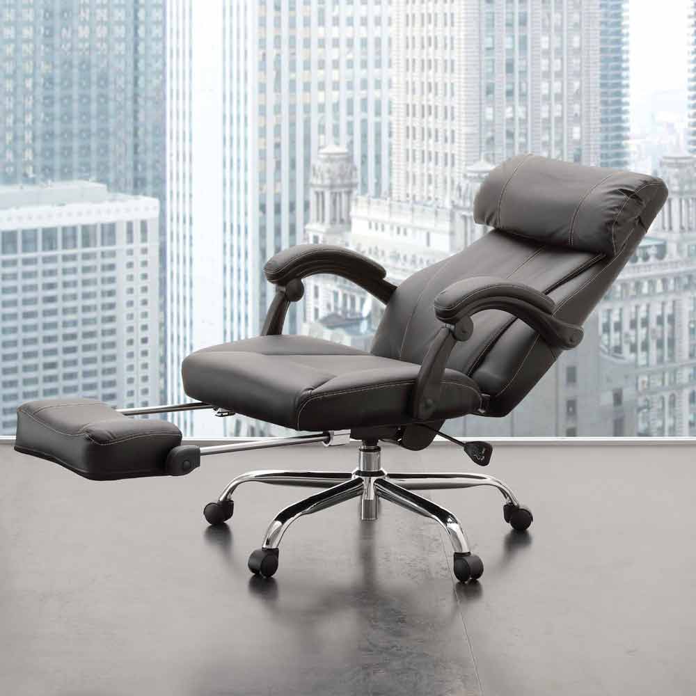 A poltrona de escritório Nazzareno representa melhor todas essas qualidades; vem com assento giratório com elevador a gás, encosto com almofada revestida em couro sintético preto, assentos e apoio para os pés em couro sintético preto; estrutura de metal cromado com rodas.