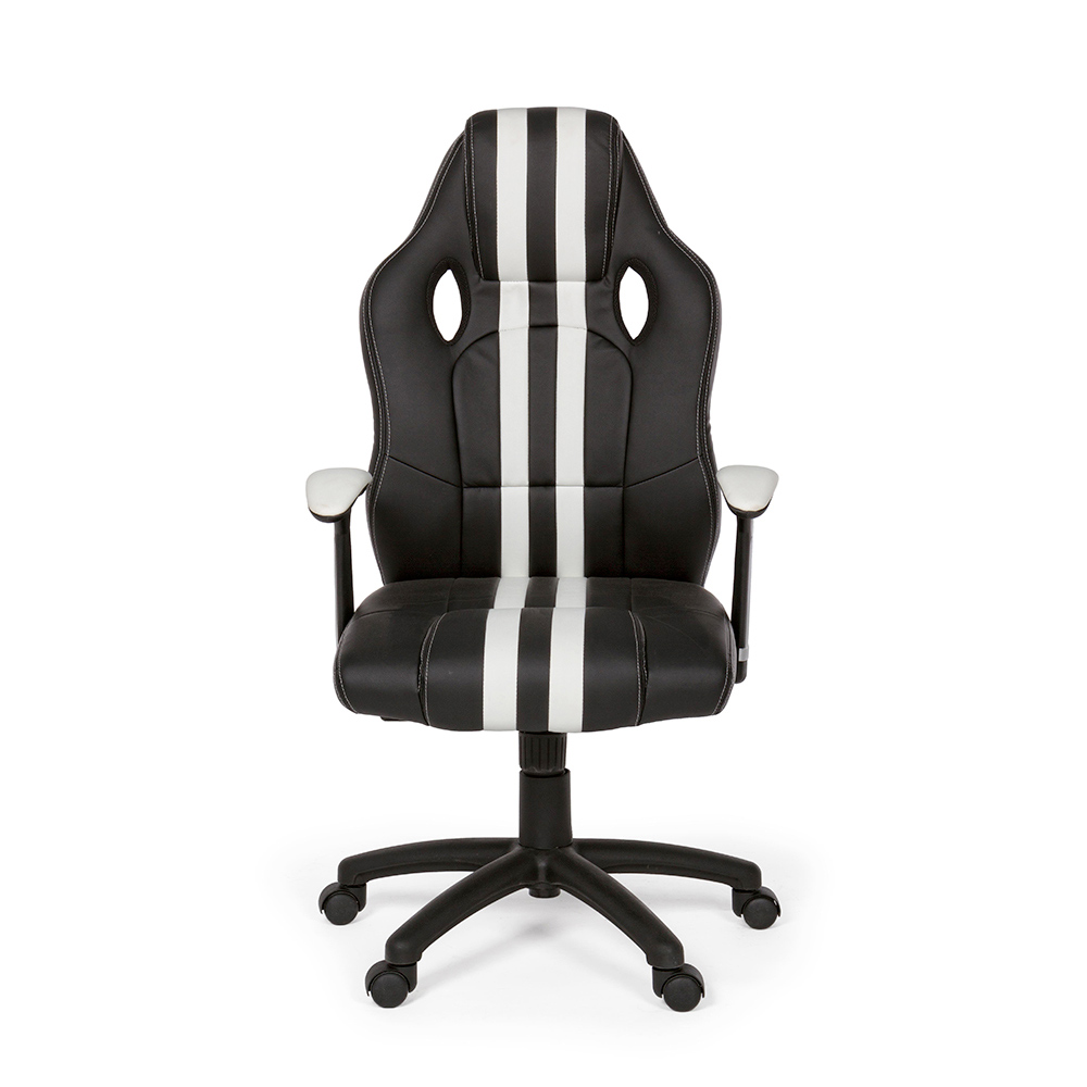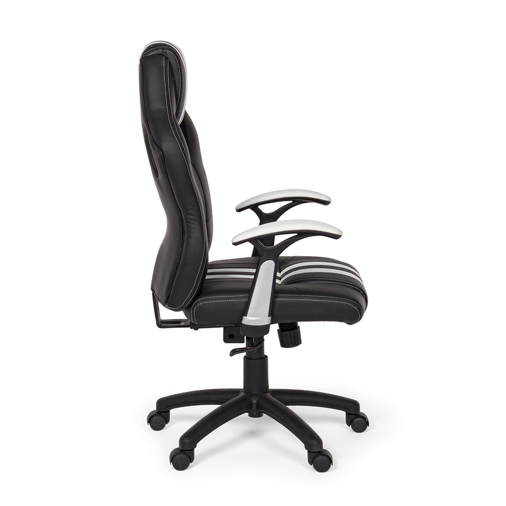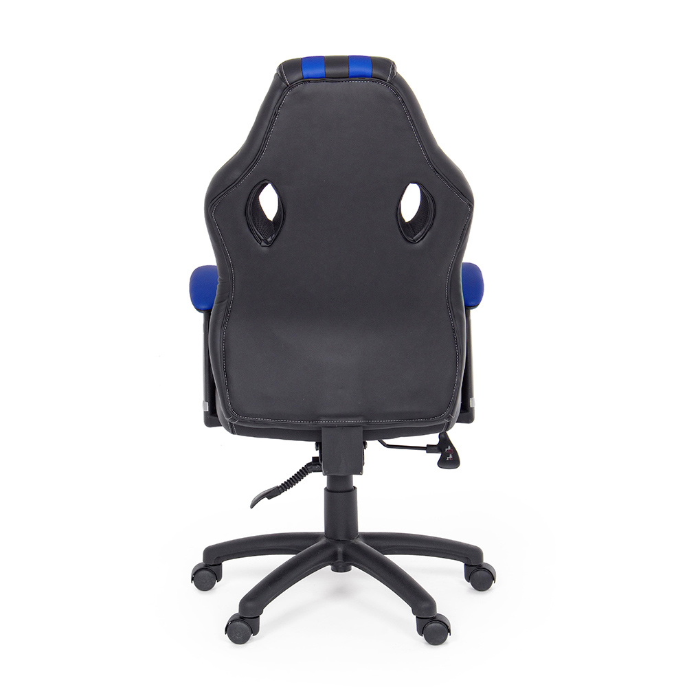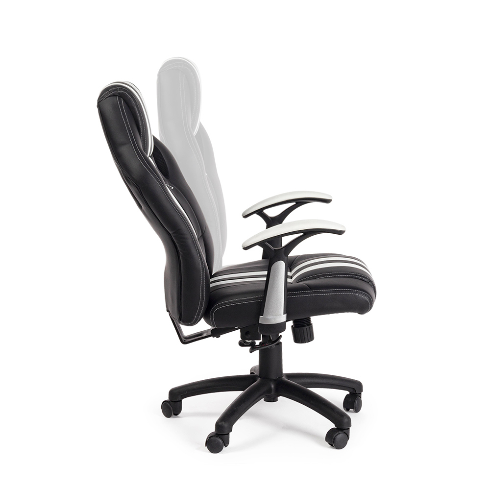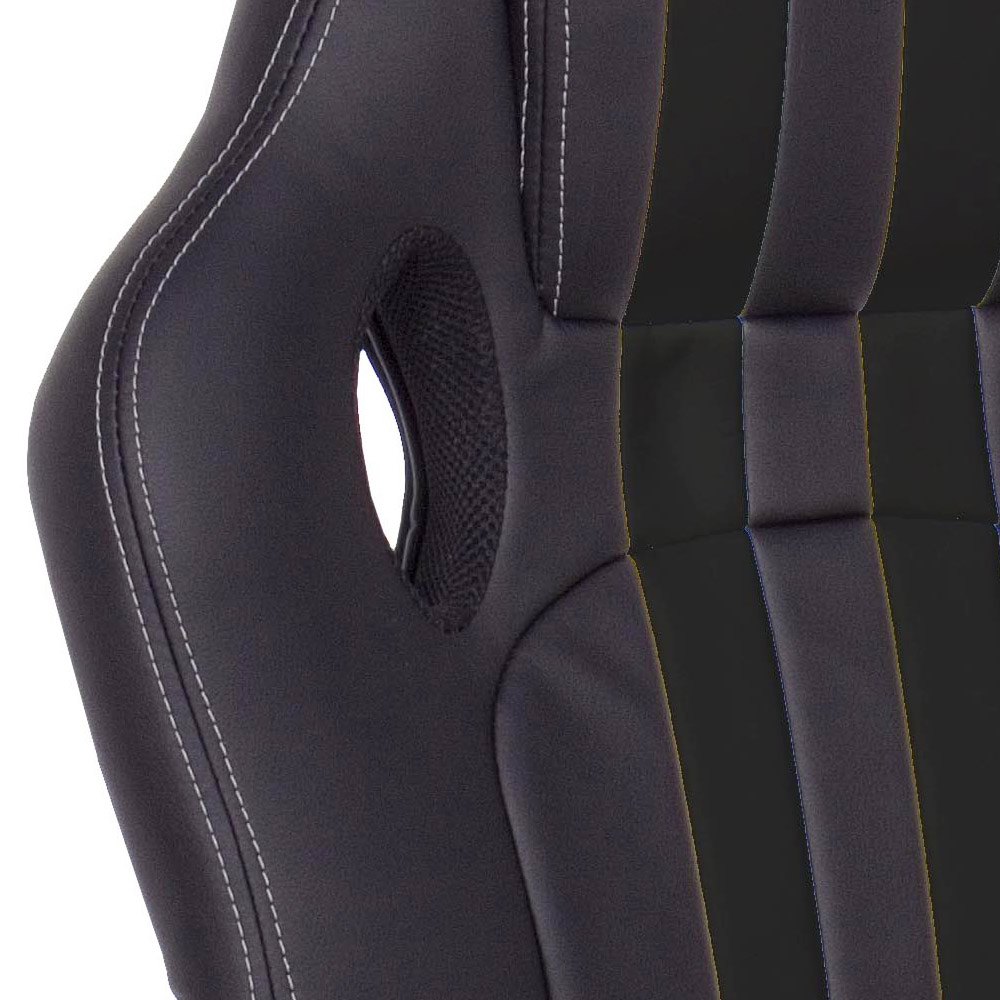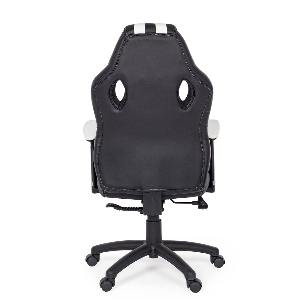 Poltrona giratória e reclinável de escritório em nylon e couro ecológico preto com detalhes coloridos.