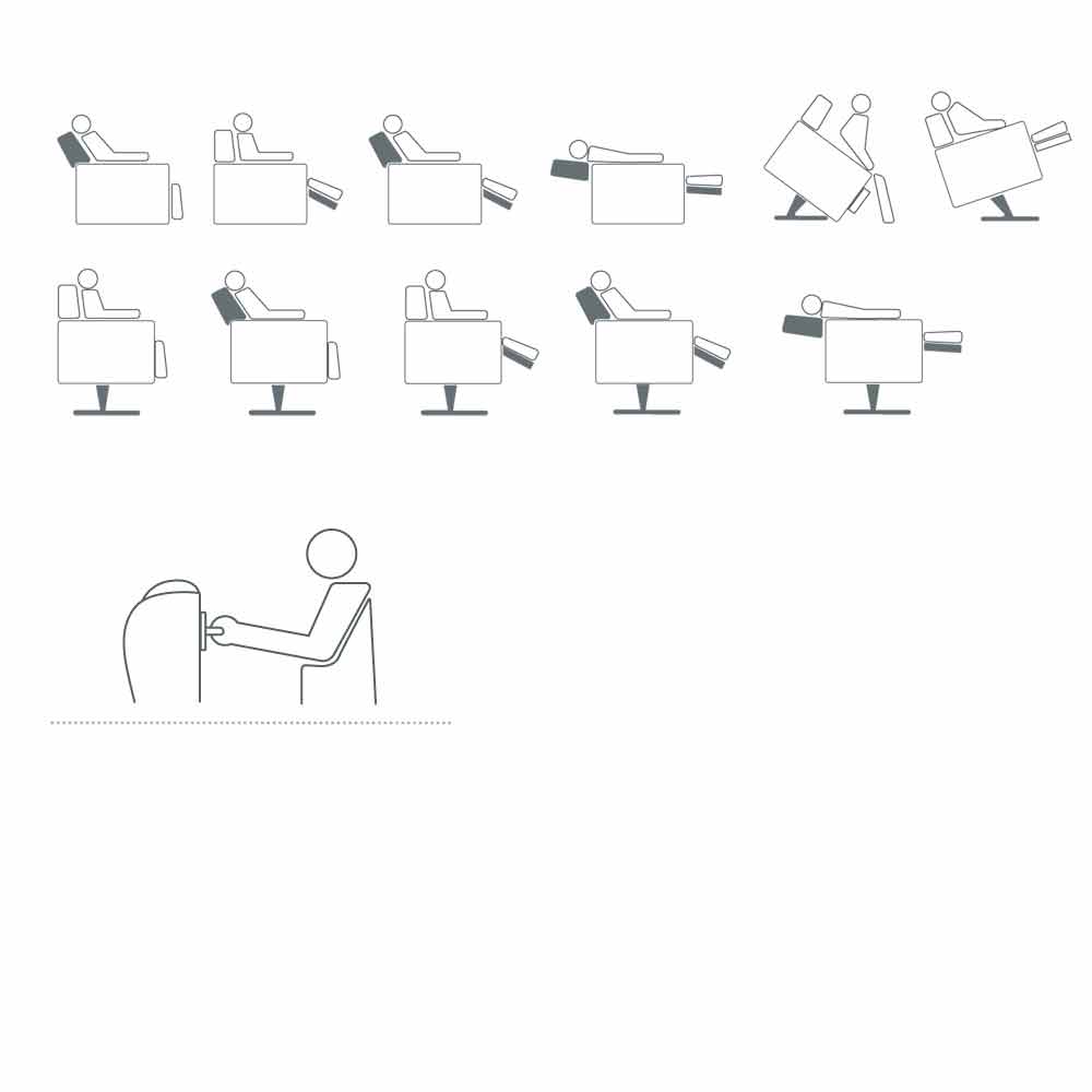 Mecanismos com um ou dois motores , movimentos do apoio para os pés e encosto alternativamente autónomos ou independentes , função de elevação , dispositivo de elevação que permite assumir facilmente a posição vertical, vibromassagem para um efeito agradável distribuído no encosto, assento e estribo, movimento automático ou motorizado, são estas as possibilidades e combinações desenvolvidas: um conjunto harmonioso de soluções para satisfazer cada tipo de necessidade.