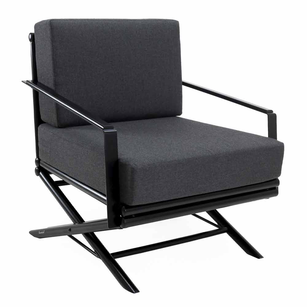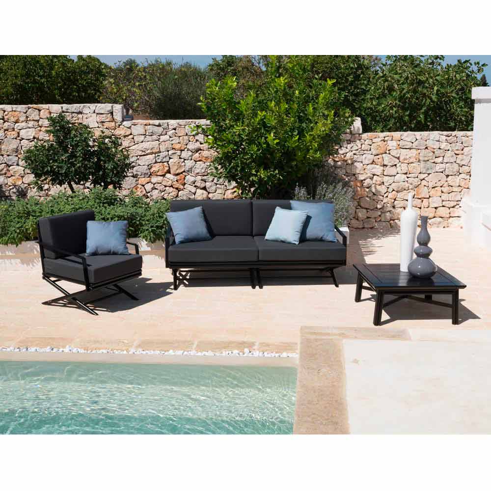 Poltrona relaxante para exterior com estrutura em madeira natural ou preta, assento batyline e almofadas em tecido, luxo made in Italy.