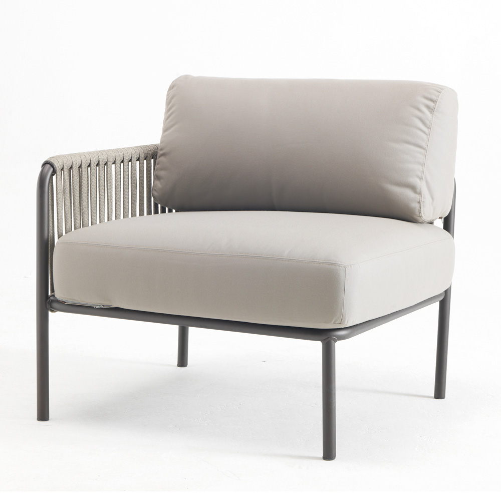 Observação : a poltrona, a corda e as almofadas estão disponíveis em uma ampla gama de cores. O apoio de braço removível pode ser colocado à direita ou à esquerda.