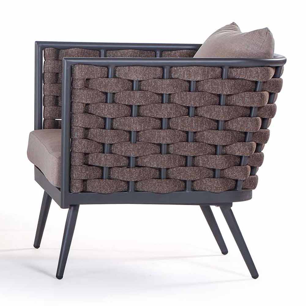 Poltrona exterior com estrutura em alumínio pintado com acabamento a grafite e cordas de poliéster com almofadas de assento e encosto revestidas a tecido acrílico castanho Uma poltrona para ambientes exteriores que alia funcionalidade a um agradável aspecto estético, conseguindo oferecer uma solução de mobiliário perfeita para quem procura um produto tão confortável e acolhedor como elegante e capaz de criar uma harmonia maravilhosa com os restantes elementos da. o mobiliário envolvente.