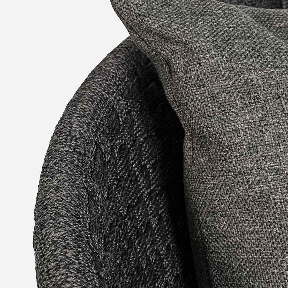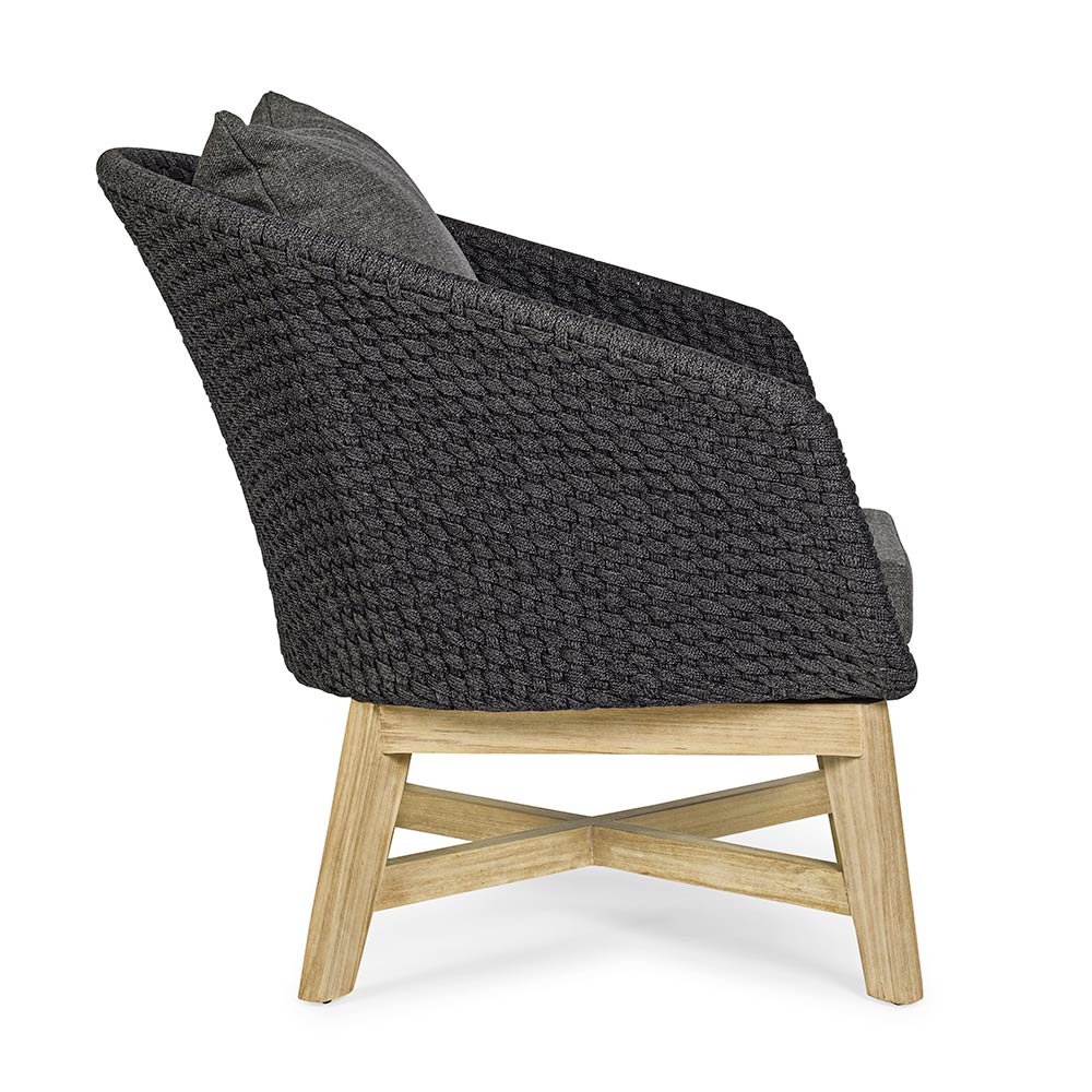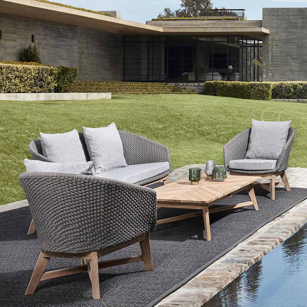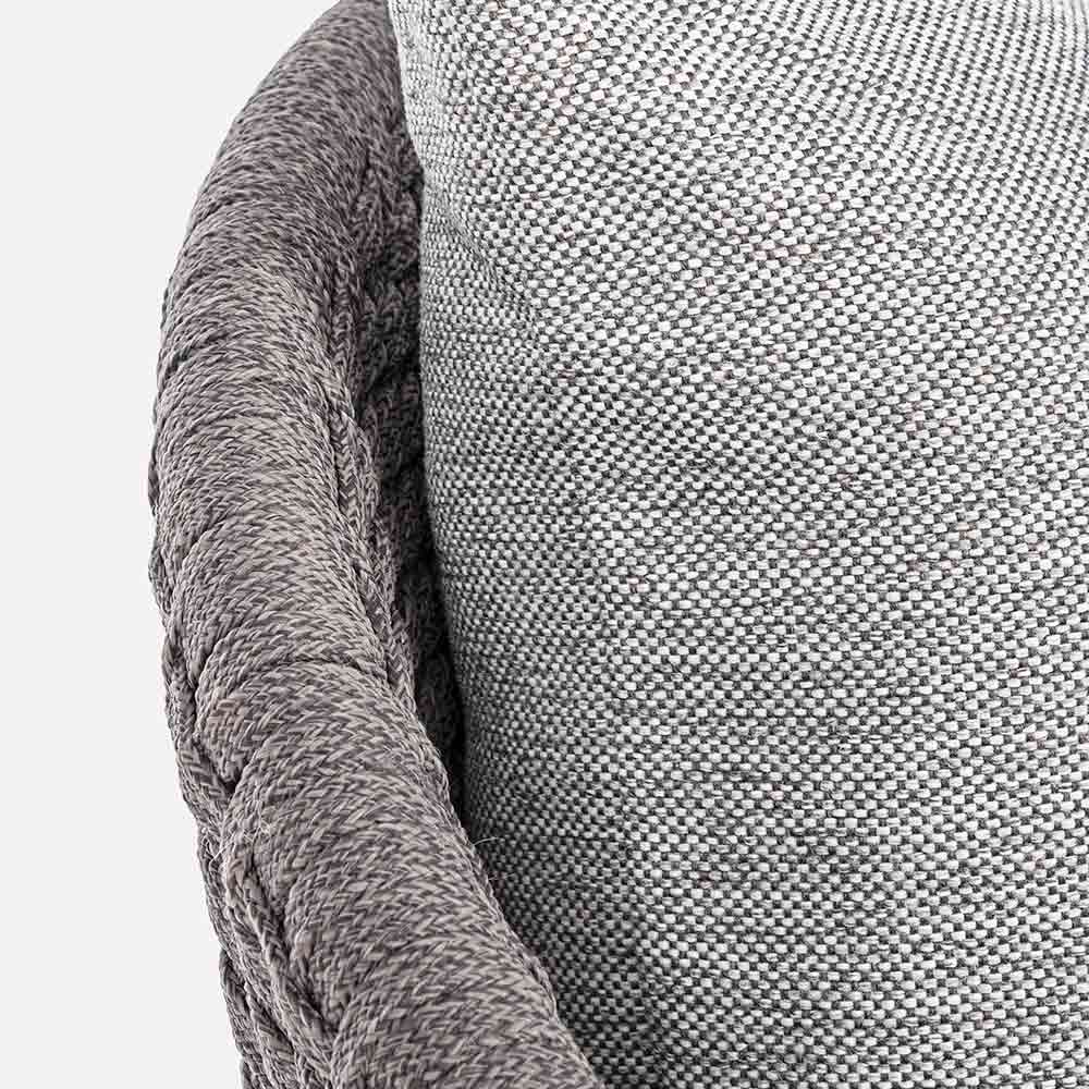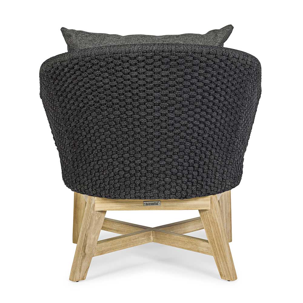 Poltrona de luxo ao ar livre em corda trançada com almofadas de tecido removíveis.