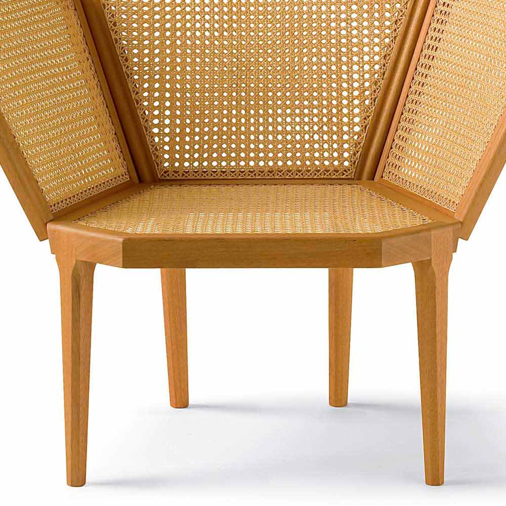 Poltrona em conserva composta por pentágonos. Um clássico da mobília, a cadeira de madeira com assento em palha de Viena típica do início do século XX, é revisitada em um olhar futurista onde técnicas tradicionais de processamento são tomadas com fidelidade e maestria, mas as formas curvas e doces do modelo original deixam espaço com linhas simplificadas e formas cristalizadas que se multiplicam no espaço.