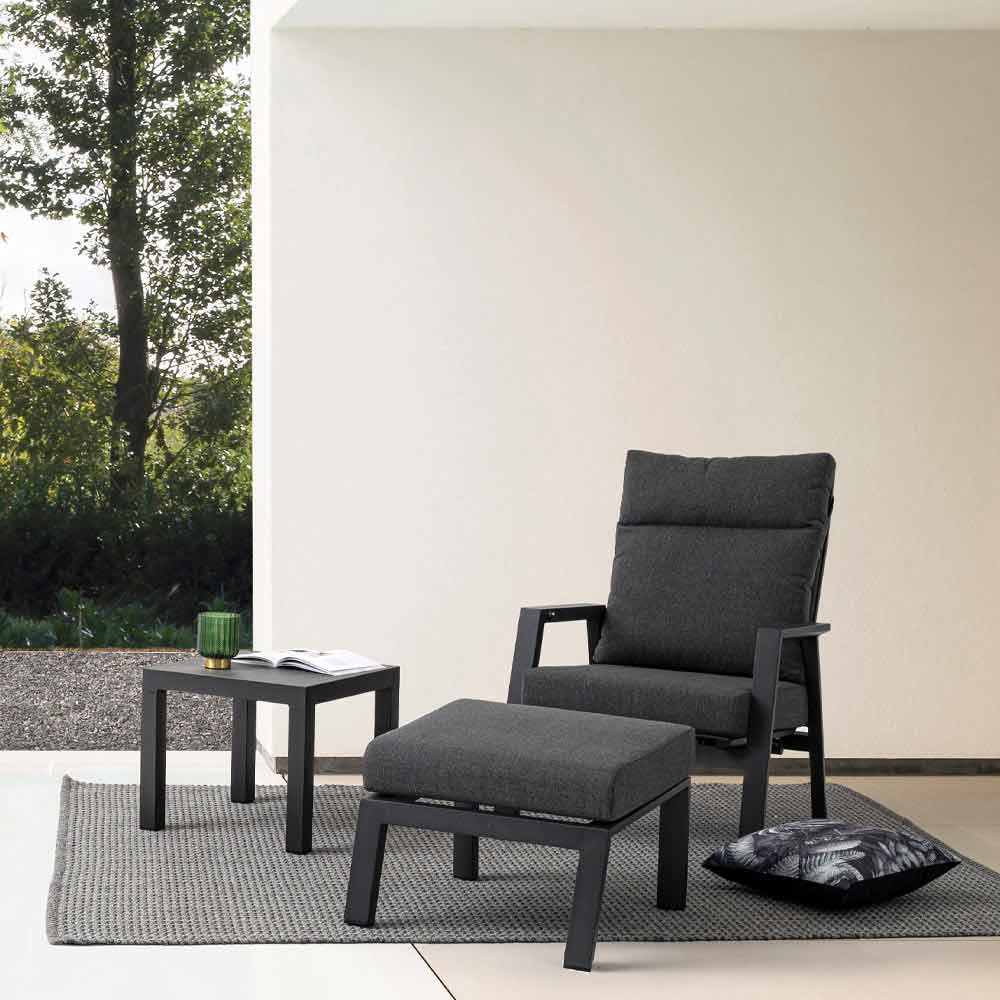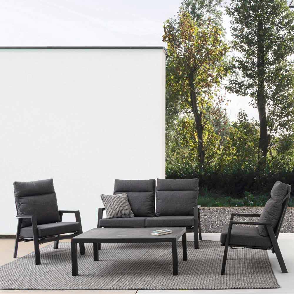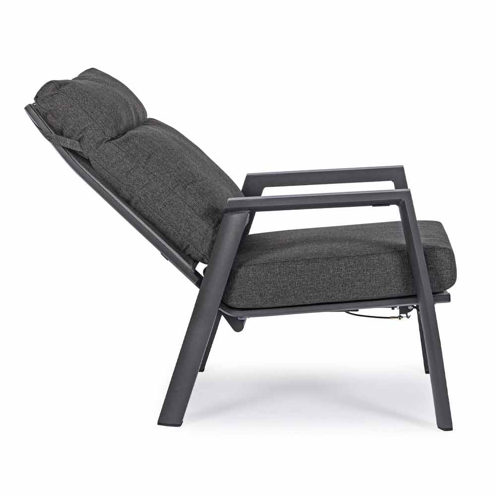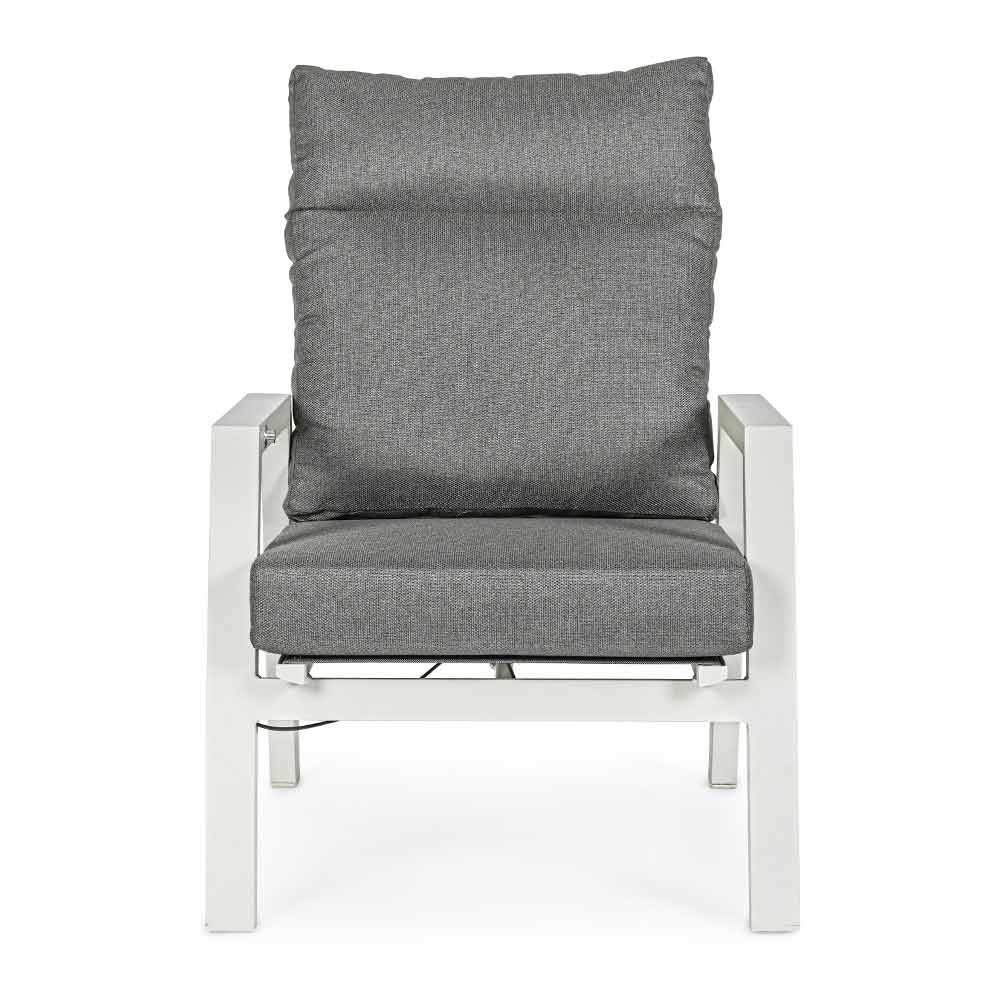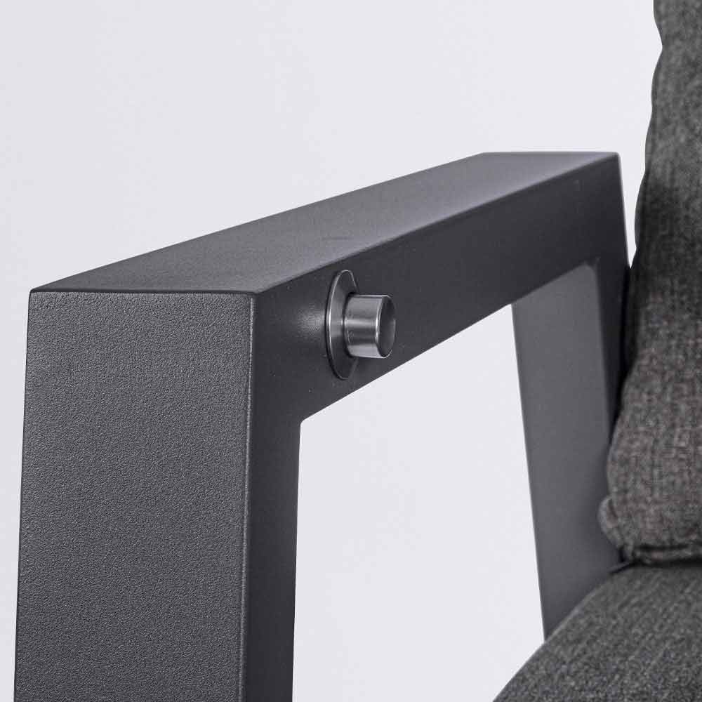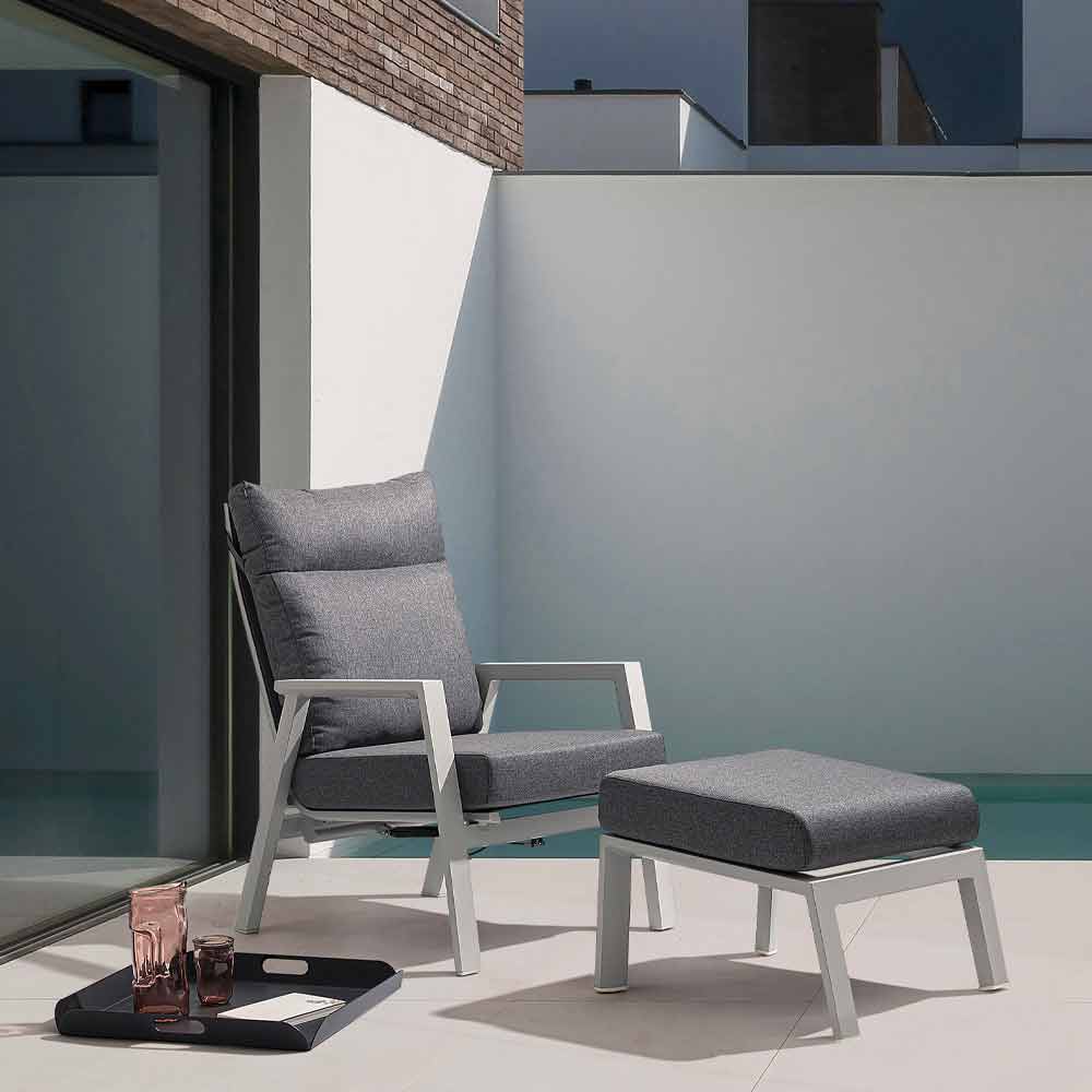 Estrutura em alumínio com revestimento em pó (poliéster). Encosto reclinável na posição livre e assento em textilene 1x1. Almofadas removíveis com tecido olefínico (100% polipropileno).