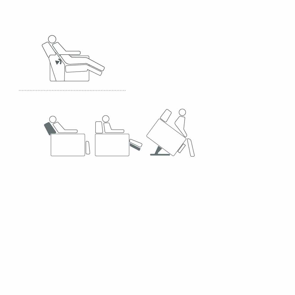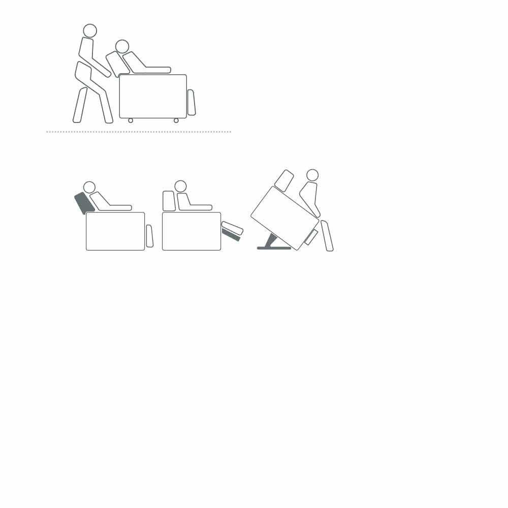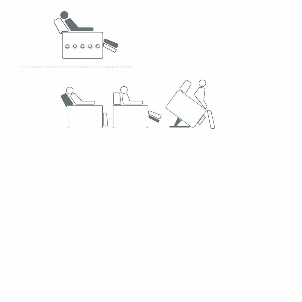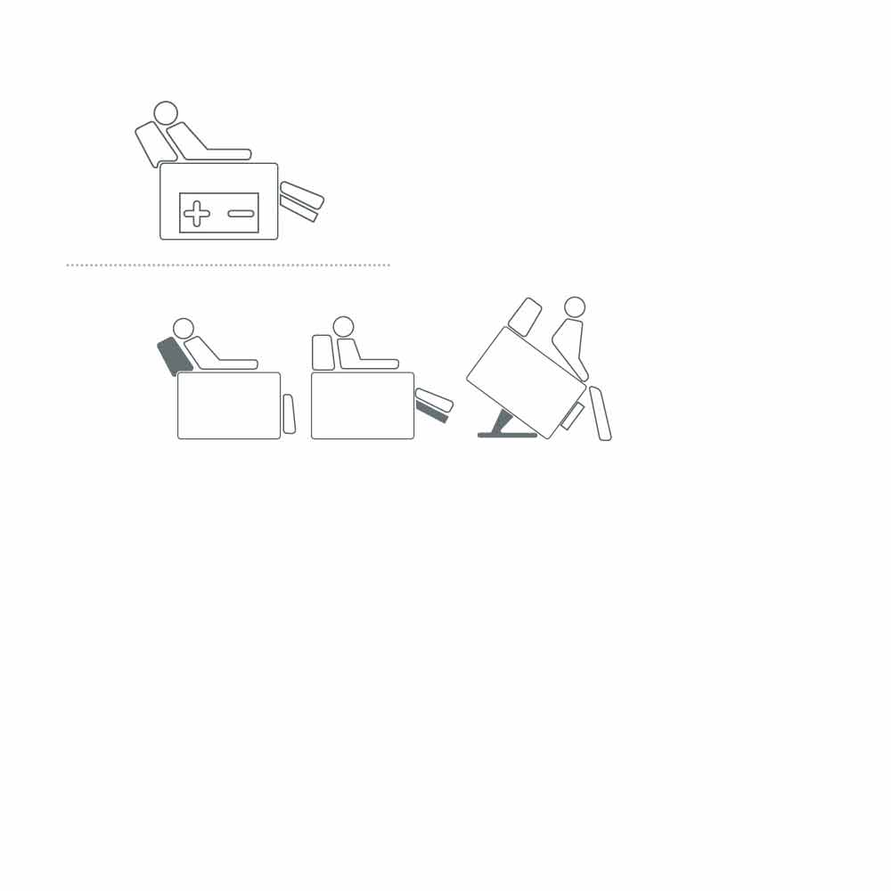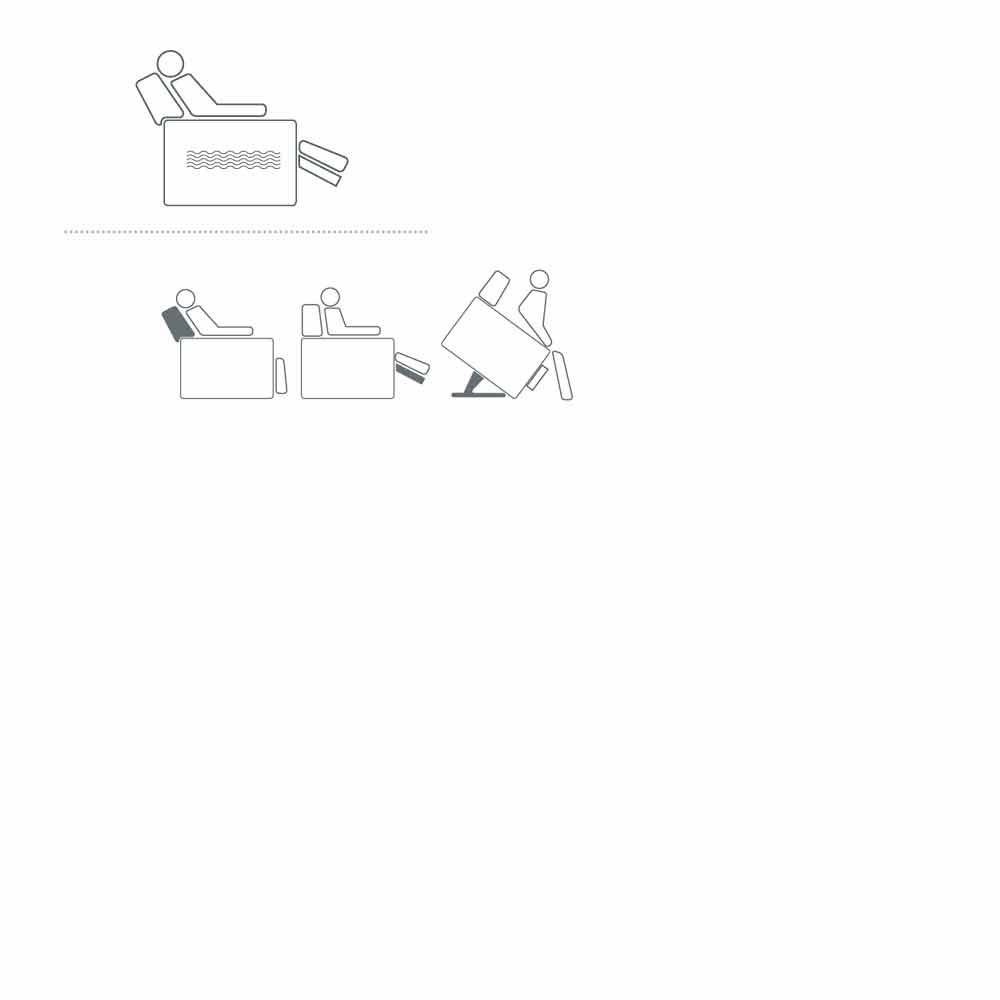 Mecanismos para um ou dois motores, o movimento do estribo e do encosto alternadamente autônomo ou independente, função de elevação, dispositivo alzapersona que permite assumir facilmente a posição vertical, vibromassagem para um efeito agradável distribuído no encosto, assento e estribo, movimento automático ou motorizado , são estas as possibilidades e as combinações desenvolvidas: um conjunto harmonioso de soluções para satisfazer todas as necessidades.