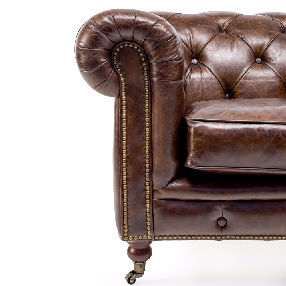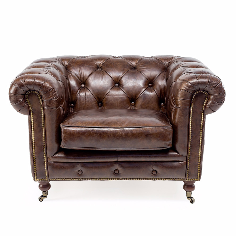 Poltrona de sala em couro verdadeiro marrom escuro , com estilo clássico inglês.