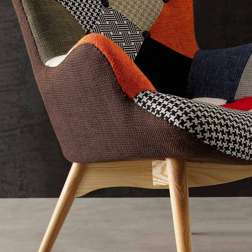Poltronas em patchwork multicolor Veronica, pés em madeira maciça. Poltrona moderna. Veronica tem pernas de madeira feitas de freixo, acabamento natural e concha patchwork multicolorida.